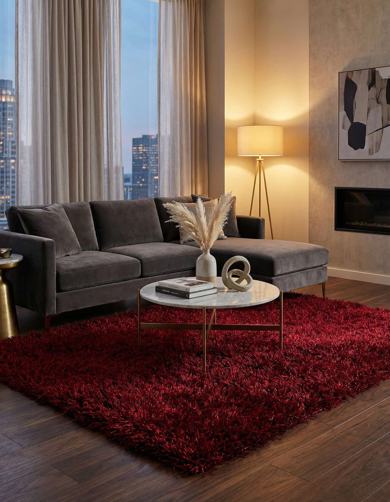 A plush 5x7 rectangular shag rug in a deep, vibrant red color, showcasing its soft, textured pile.
