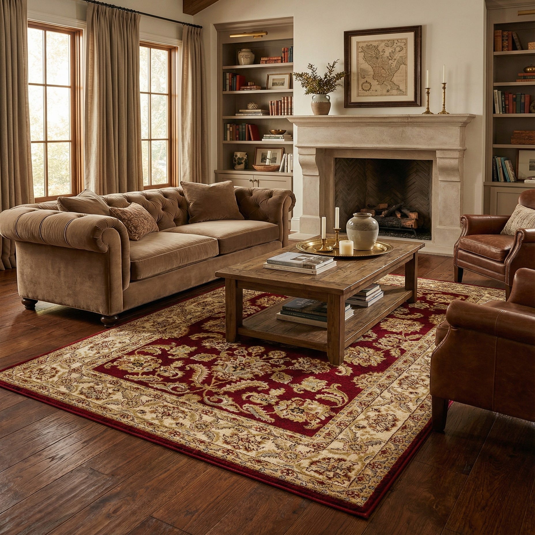 The rug's construction offers both stain resistance and a shed-free quality, catering to a low-maintenance lifestyle. This piece can anchor a room with its bold color and complex patterns, making it an ideal choice for interiors that lean towards classic, traditional, or even vintage-inspired decors.