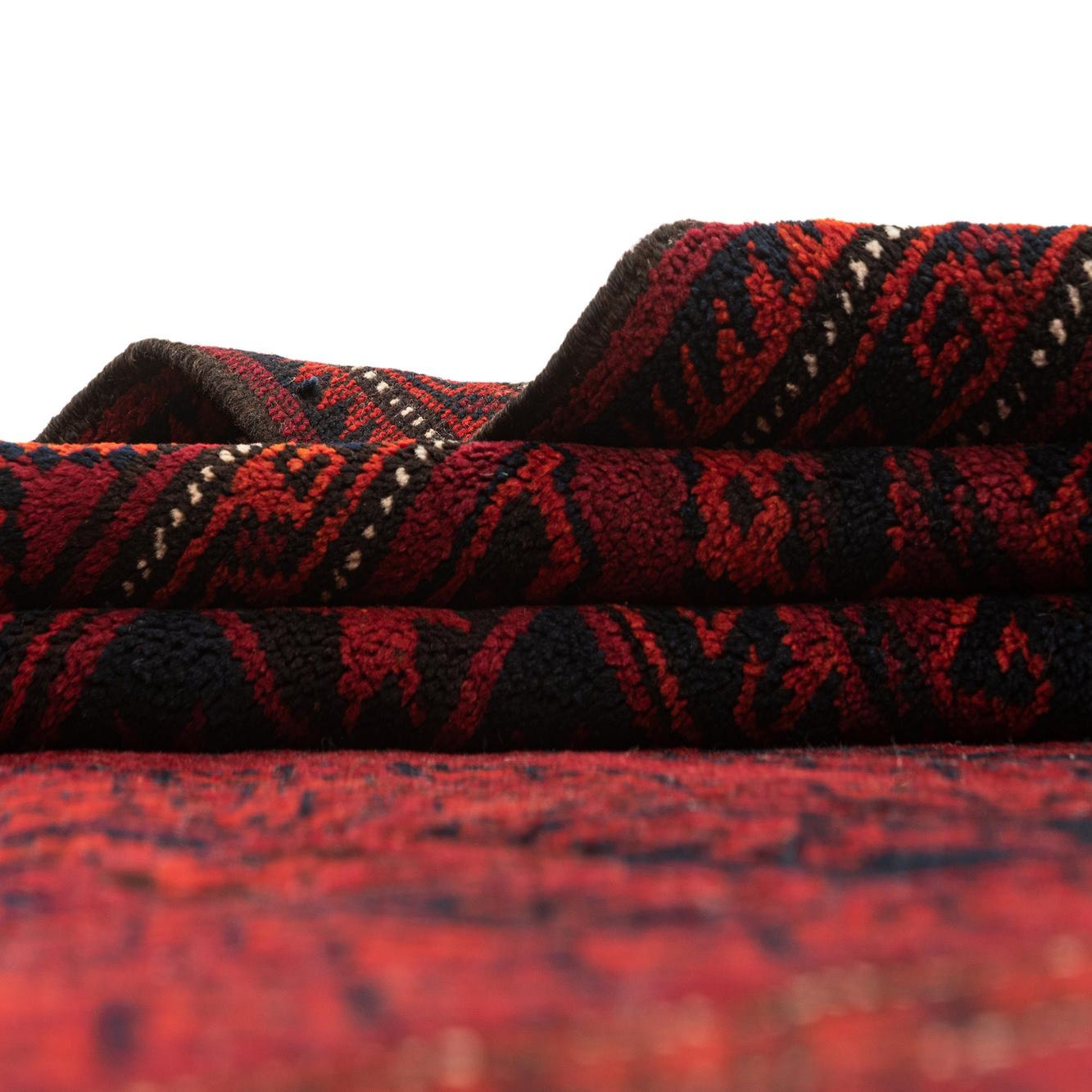 A 5x8 rectangular Afghan Akhche rug in deep reds and black with intricate tribal geometric patterns and fringe.