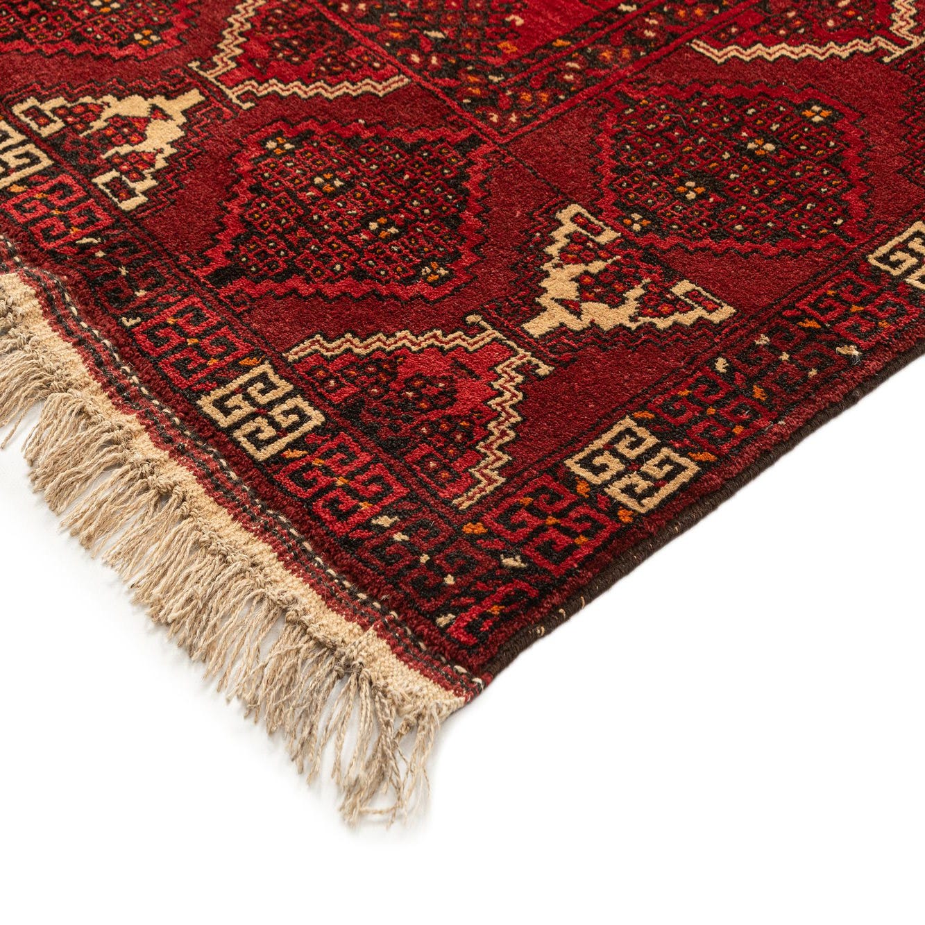 A 5x8 rectangular Afghan Akhche rug in deep reds, featuring intricate tribal patterns and a thin pile.