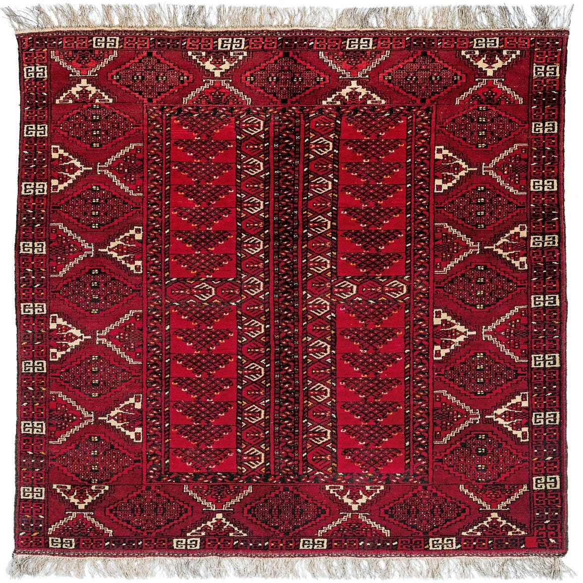 Primary color is Red. Colors in this rug include: Red, Black, Ivory.