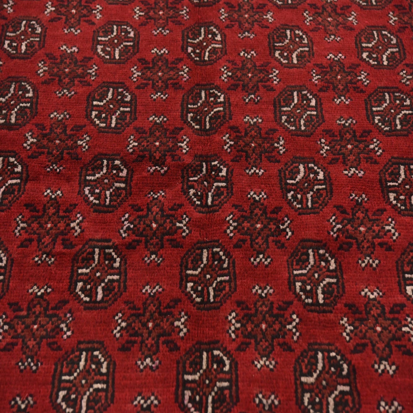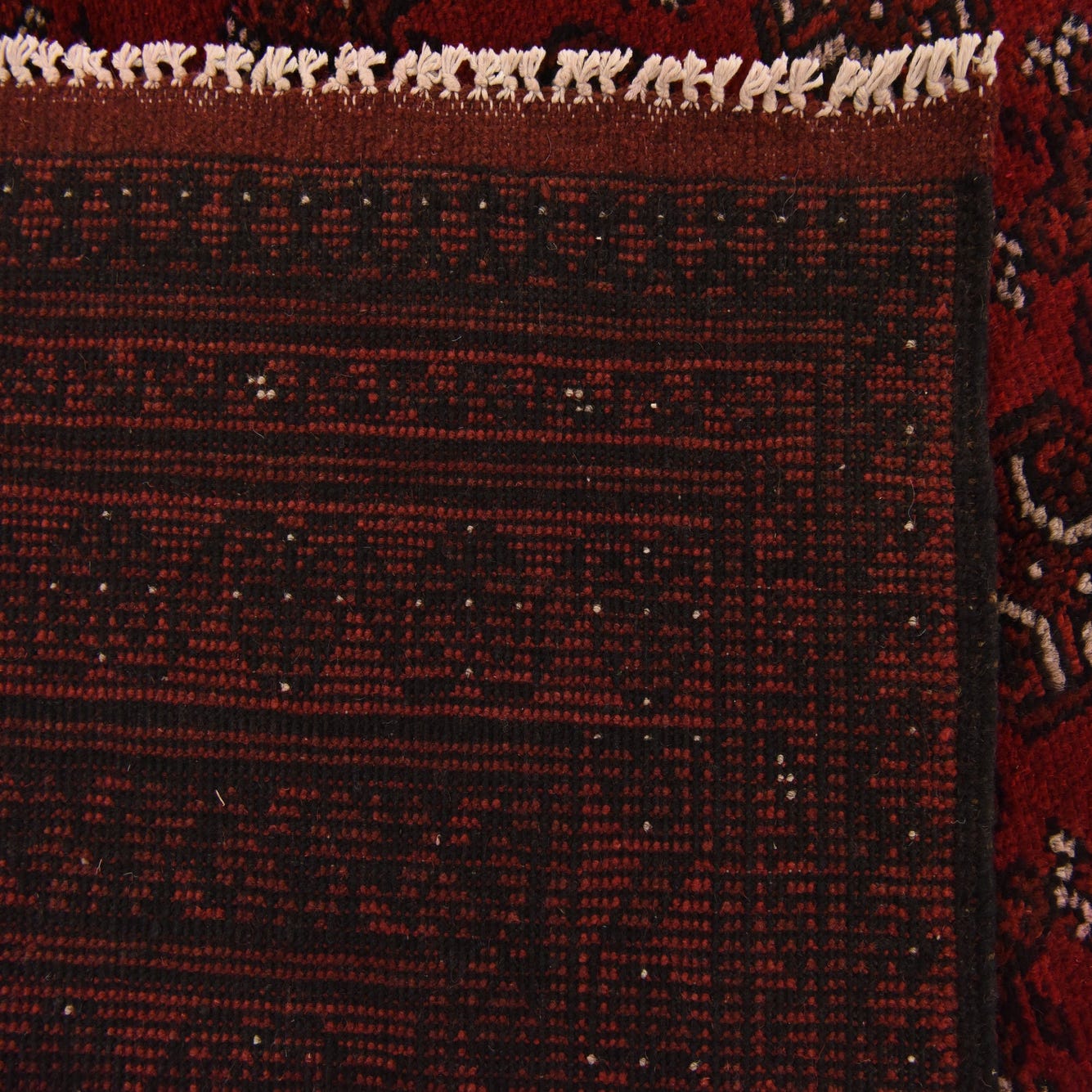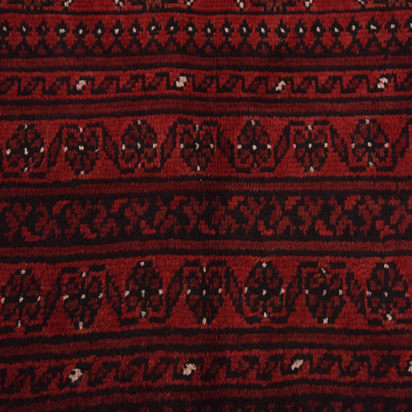 Primary color is Red. Colors in this rug include: Red, Beige, Black, Burgundy.