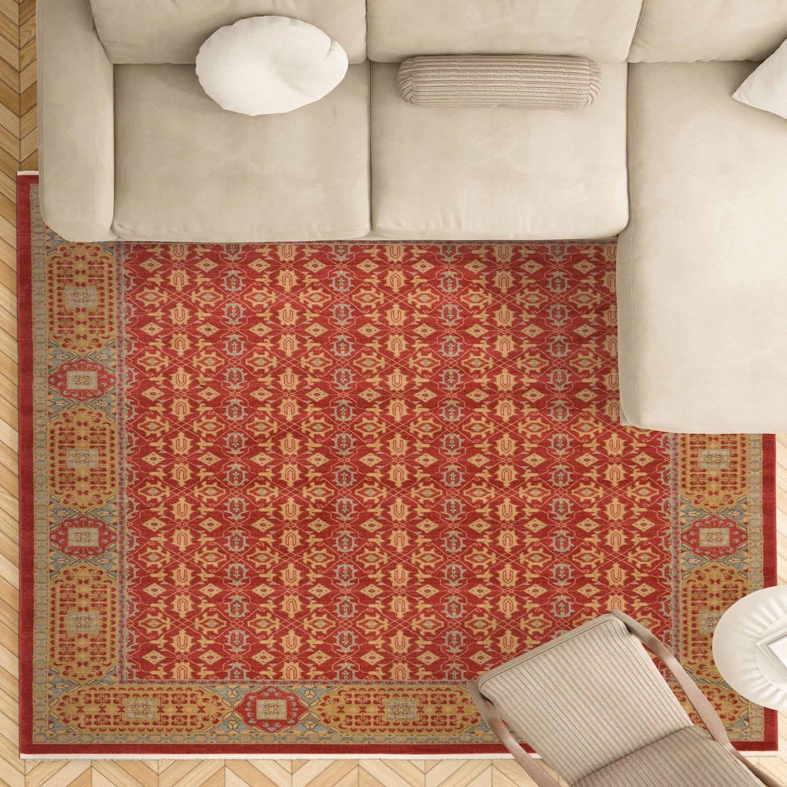 Decoratively versatile, this piece is well-suited for a variety of interior design scenarios. It could serve as a statement piece within a neutral contemporary setting, drawing in warmth and character. Alternatively, it complements more traditional decors with its classic pattern and color scheme. Its rich color palette and intricate design work harmoniously with wooden furniture tones, adding depth to living rooms, dining areas, or home offices.