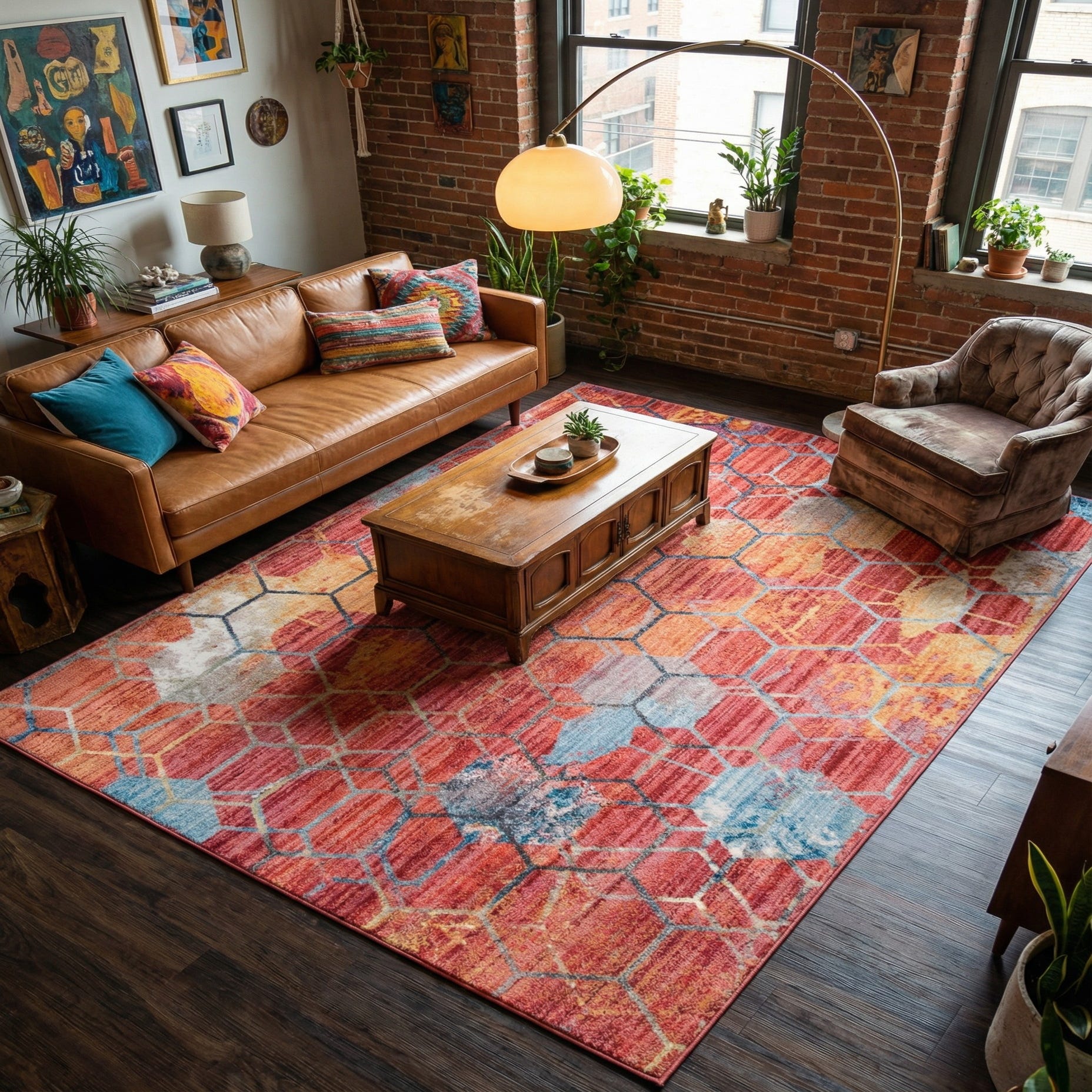 This rug works well as a focal anchor for a living room or beneath a coffee table, and it adds color and texture to a bedroom or home office. Pair it with warm wood furniture and neutral upholstery to let the red and gold glow, or introduce navy and denim-toned accents for contrast. Brass or gold-metal accessories and violet or coral textiles will pick up the rug’s accent tones, and the mix of geometry and painterly color complements contemporary, mid-century modern, eclectic, or bohemian interiors.