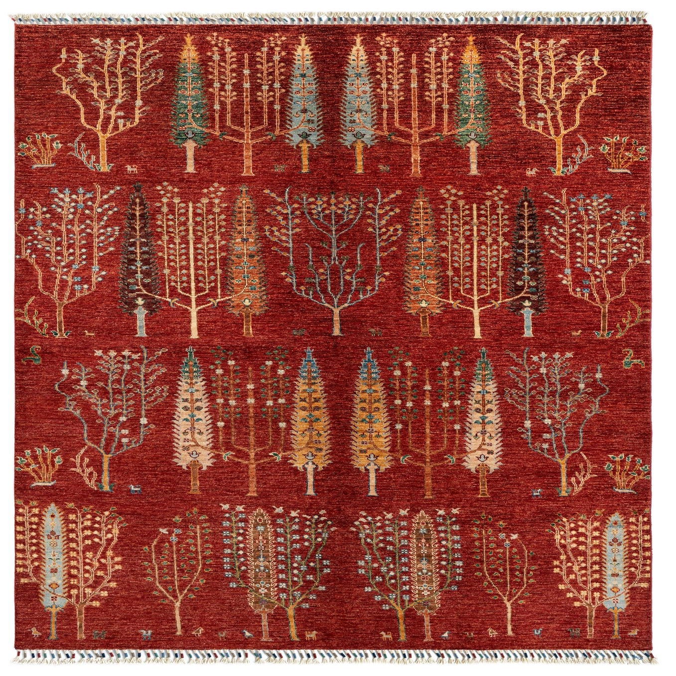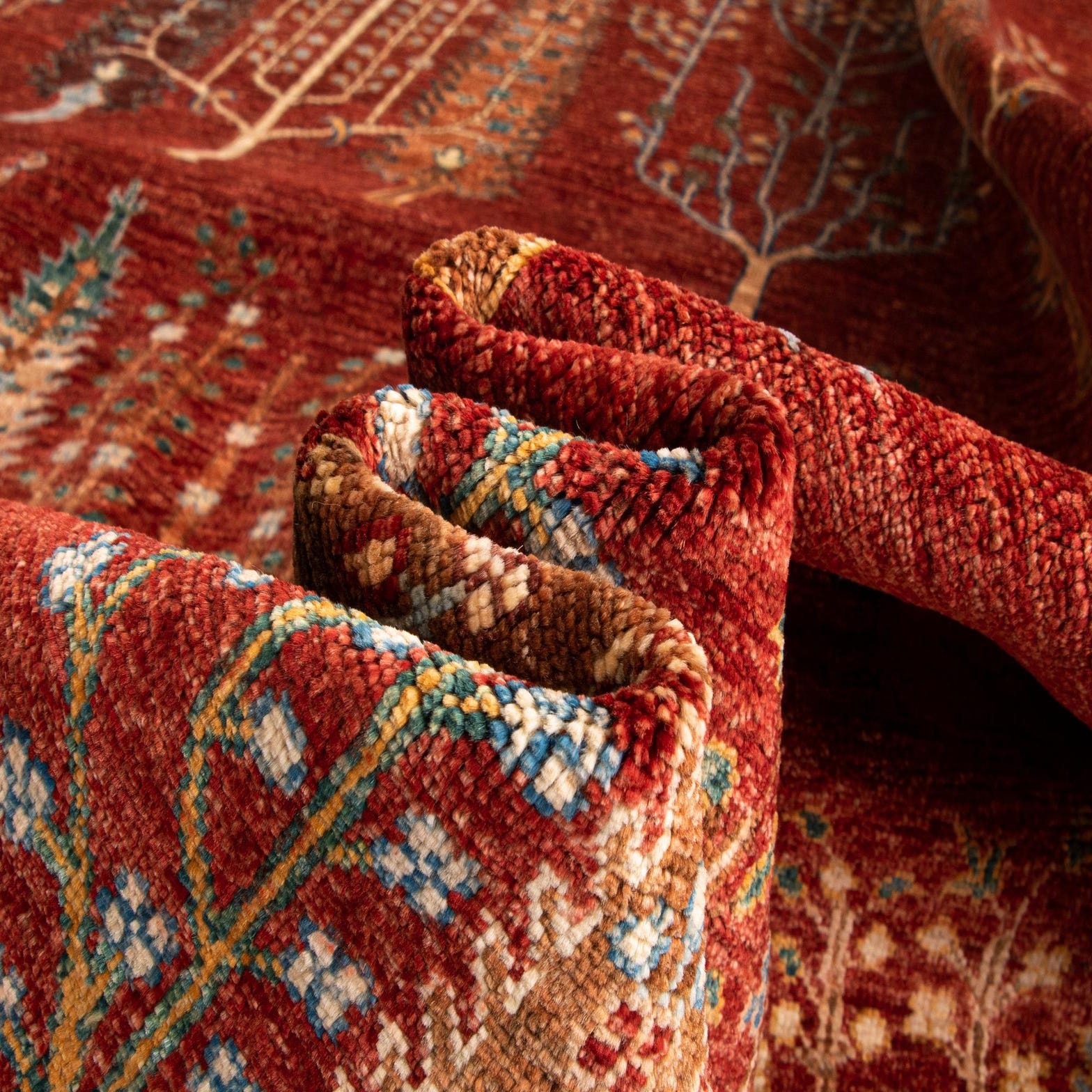 The Ariana collection presents a meticulously handcrafted 5x8 area rug, boasting a rich red background that anchors its design. Constructed with 100% wool, this piece ensures both durability and comfort underfoot. An array of detailed trees feature prominently on the rug, each rendered with precision and a harmonious blend of beige, blue, brown, and green tones that enhance the rug's visual appeal.