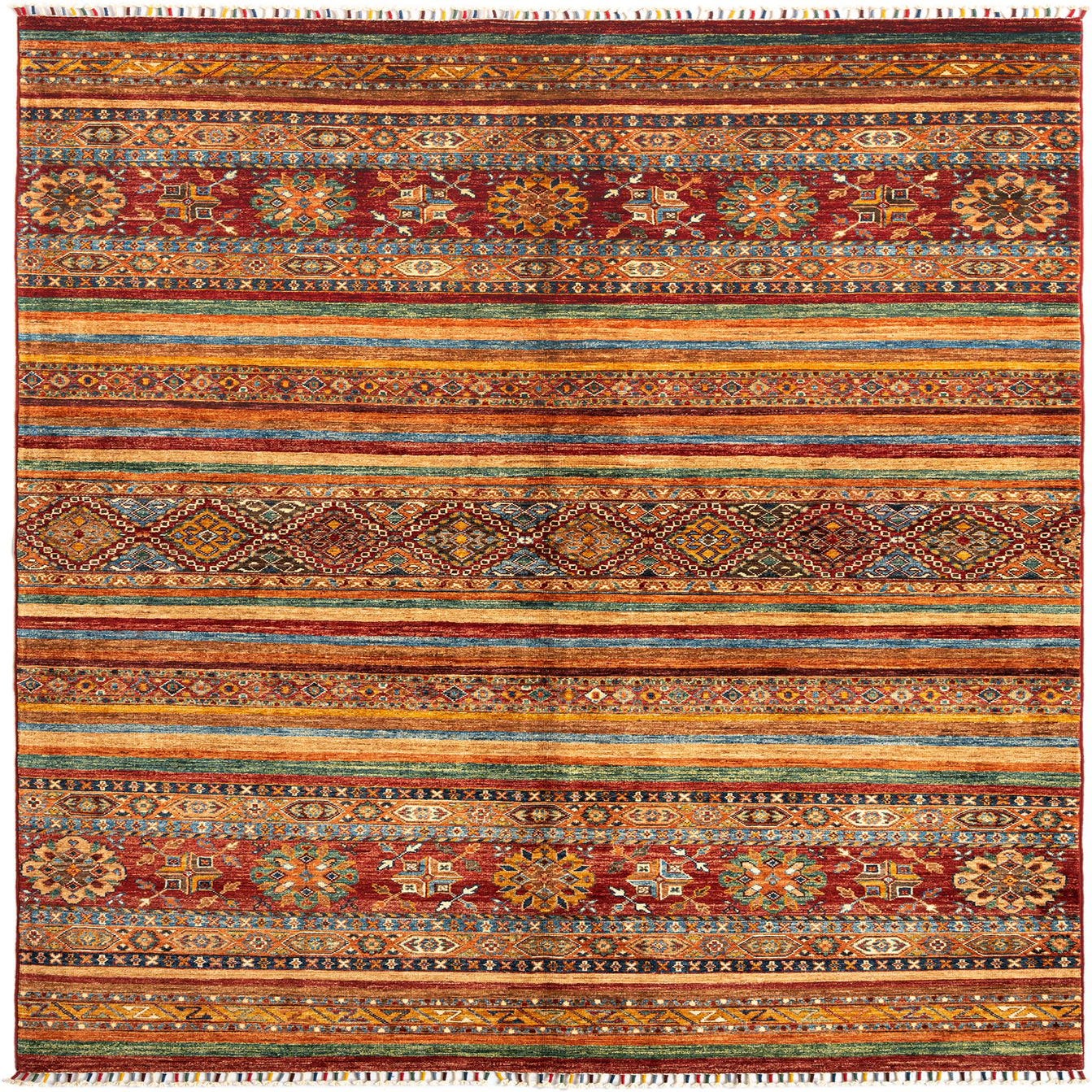 The Ariana Ziegler collection presents a hand-made 5x8 rug crafted from 100% wool, offering both durability and a soft, comfortable texture underfoot. This piece boasts a rich palette, with a deep red background that sets the stage for an array of vibrant hues including orange, brown, blue, cream, burgundy, and peach. Its design features a fusion of traditional motifs, with geometric patterns and tribal-inspired symbols creating a dynamic visual landscape that captures attention.