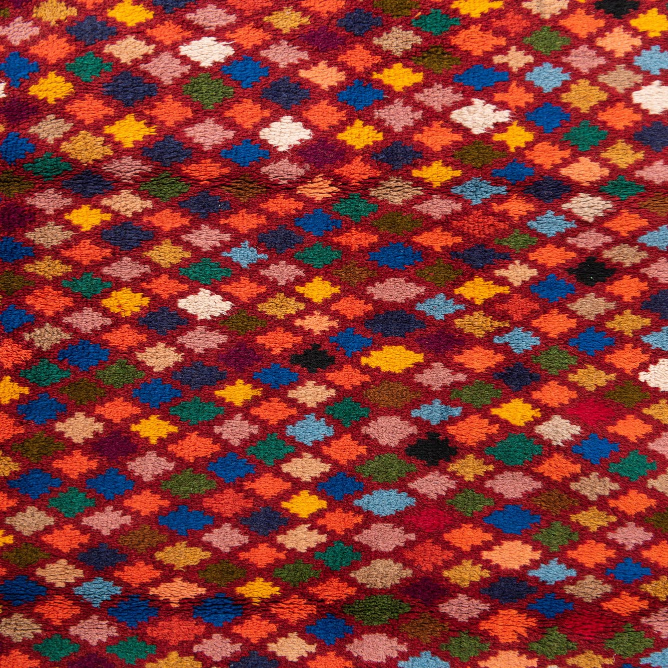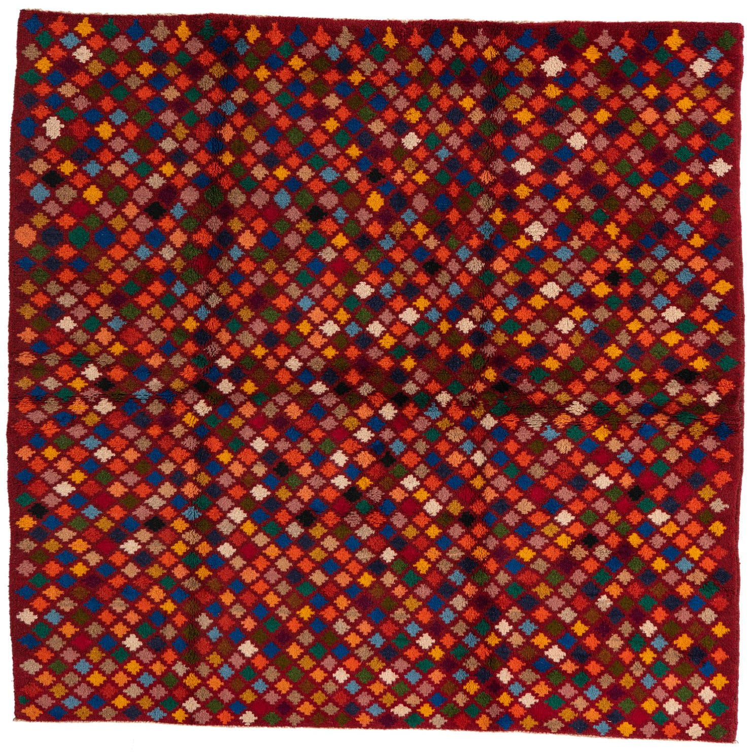A 5x8 rectangular Balouch rug with a vibrant tribal pattern of multicolored diamonds on a rich red background.