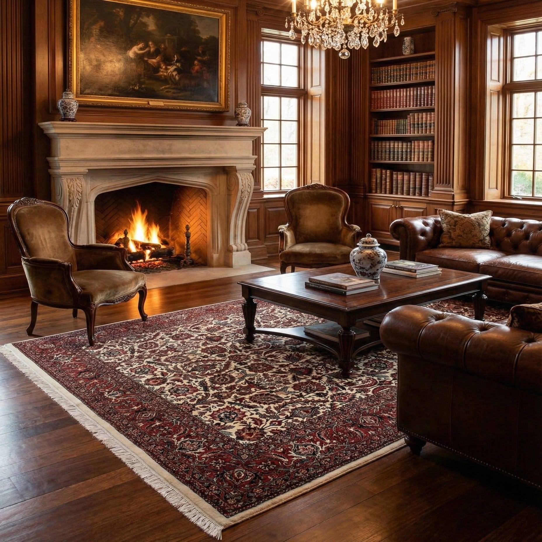 Handmade of wool with silk, the pile offers a firm, low-profile feel underfoot with a soft, satiny sheen from the silk accents. The tightly knotted construction gives the motifs crisp edges and a pleasing tactile contrast between the slightly more elevated field and the flatter border. Place this rug to anchor a formal seating area, beneath a dining table to complement warm wood tones, or in a study or entry where its rich color and detailed pattern will add warmth and visual interest. It pairs well with neutral upholstery, deep wood furniture and metal or brass accents for a layered, refined interior.