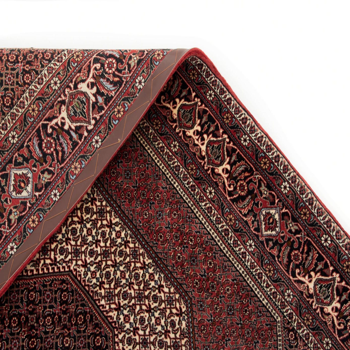 This Bidjar With Silk rug is a hand-made, 5x8 piece that showcases a sophisticated blend of wool and silk materials. The design features a profound red background, providing a bold yet traditional foundation for the intricate patterns it hosts.