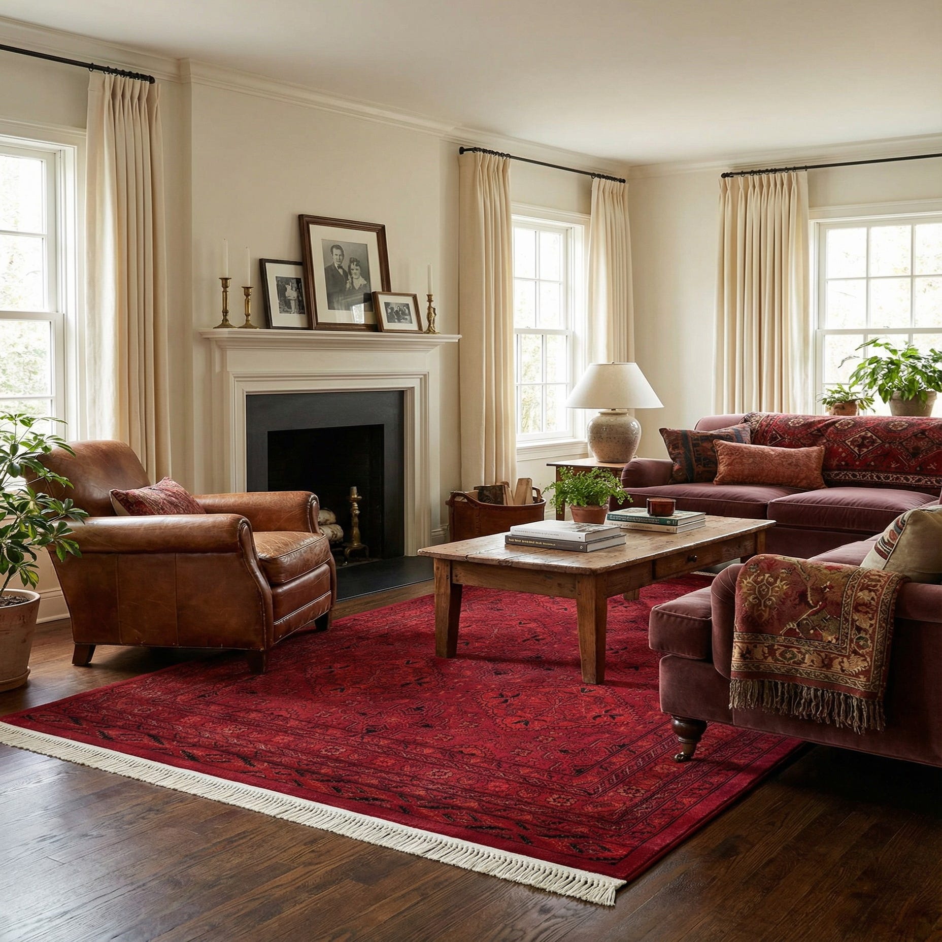 Machine made of 100% polypropylene, this rug has a low, dense pile with a smooth, slightly velvety hand that feels comfortable underfoot and holds its shape over time. It pairs well with traditional and transitional interiors—try it under a seating group with dark wood furniture, anchored beneath a neutral sofa to introduce warmth, or placed in a study or entry to add color and structure. The red and terracotta tones work nicely with leather and natural wood, while the black and cream detailing helps coordinate with metal accents and patterned textiles.