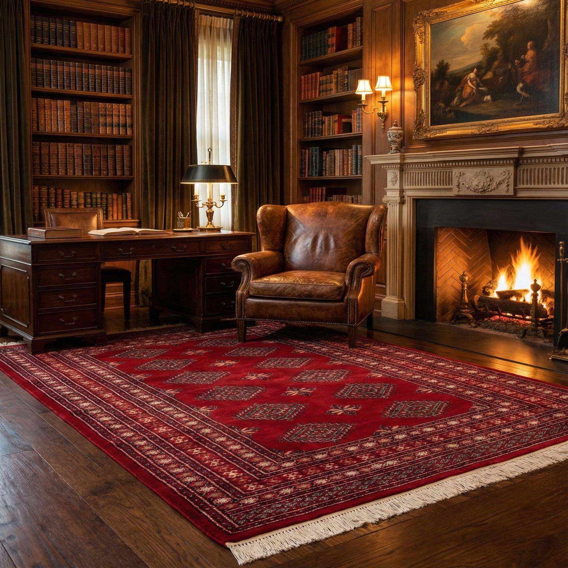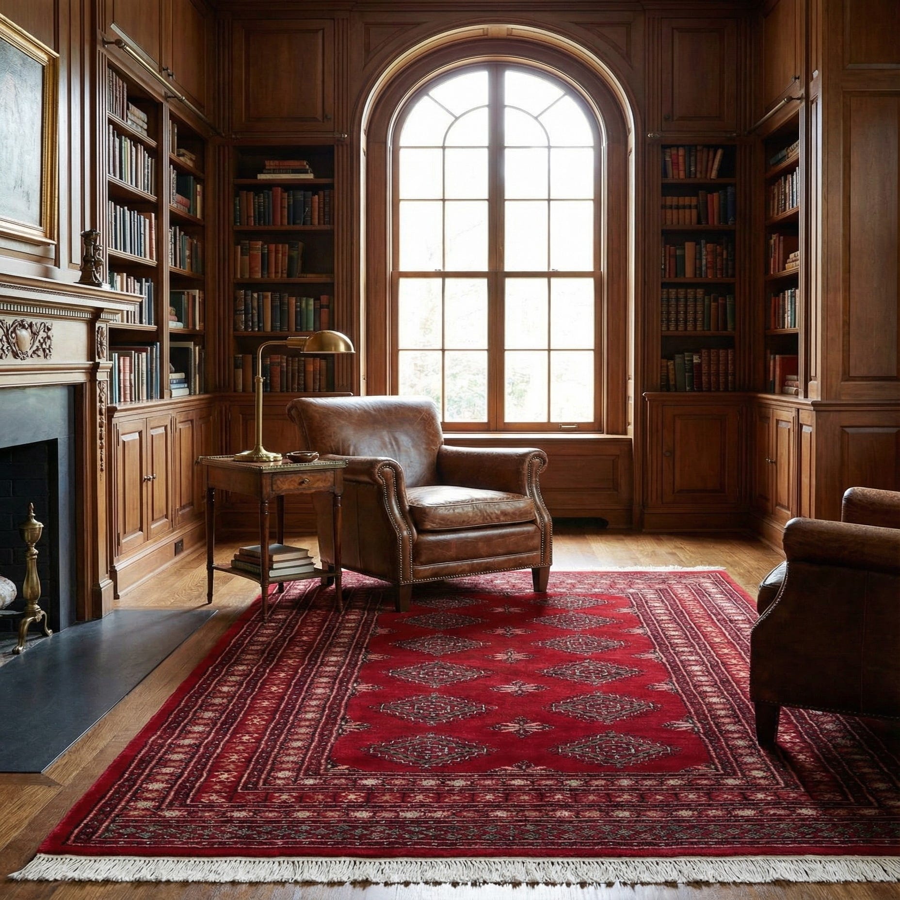 A 5x8 rectangular red wool rug with a traditional tribal pattern and white fringe, ideal for a living room.