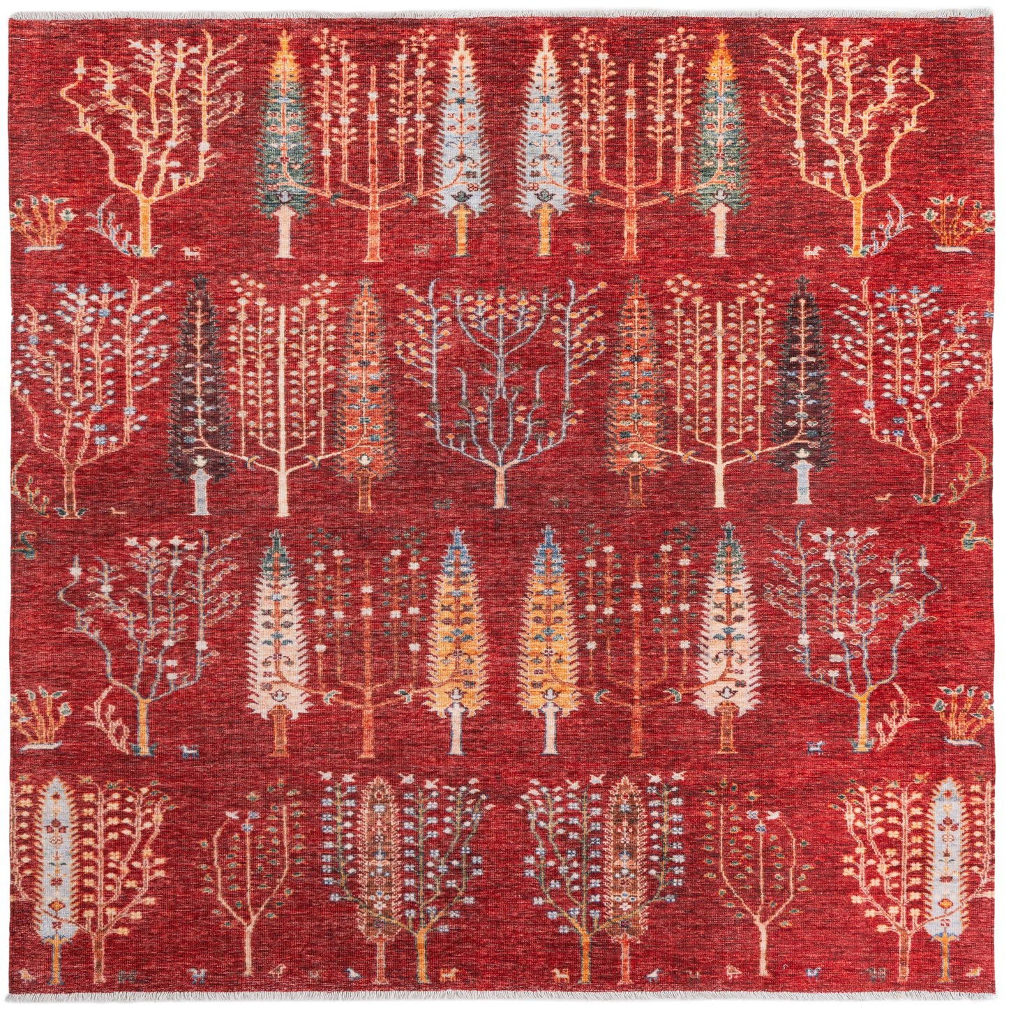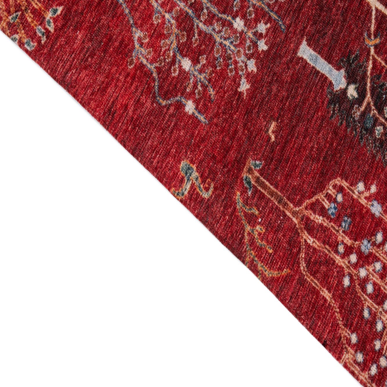 Primary color is Red. Colors in this rug include: Red, Black, Blue, Brown, Orange, Ivory.