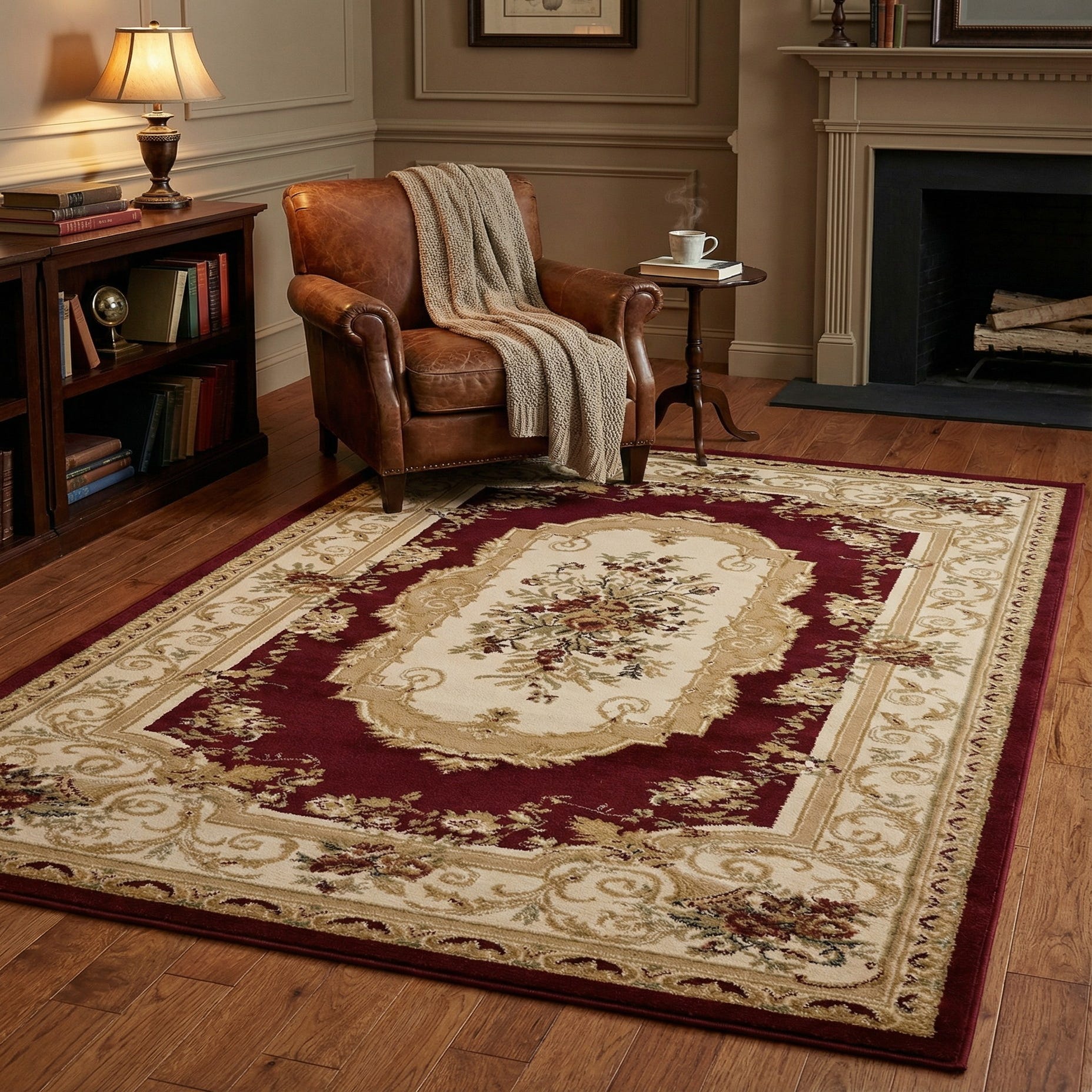 A classic European-inspired pattern anchors this rug with a central cream medallion framed by a tan cartouche and set against a rich red background. Ornate scrollwork and floral sprays trace the inner field and border, where rust red, brown, green and candy accents punctuate the bouquet motifs. The layered borders—cream outer guard, tan filigree, then the deep red field—create a formal, symmetrical composition that reads traditional without feeling fussy.