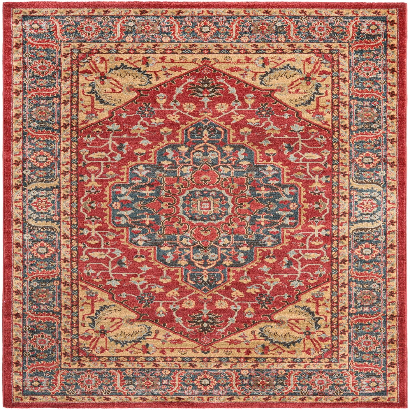 Primary color is Red. Colors in this rug include: Red, Light Blue, Brown, Light Green.