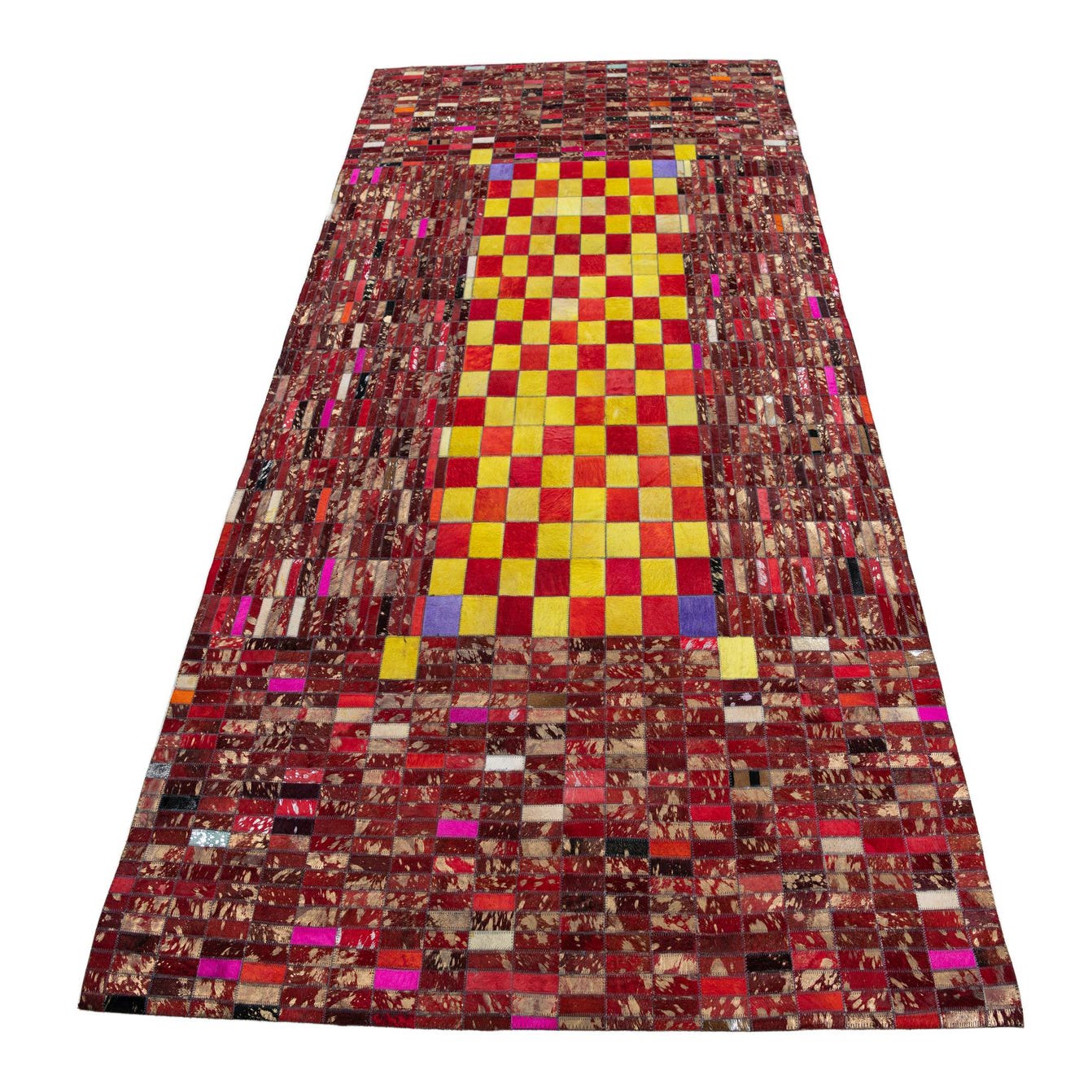 A 5x8 rectangular Cowhide Leather rug featuring a central yellow and red checkerboard pattern, framed by a border of red and brown patchwork leather strips.