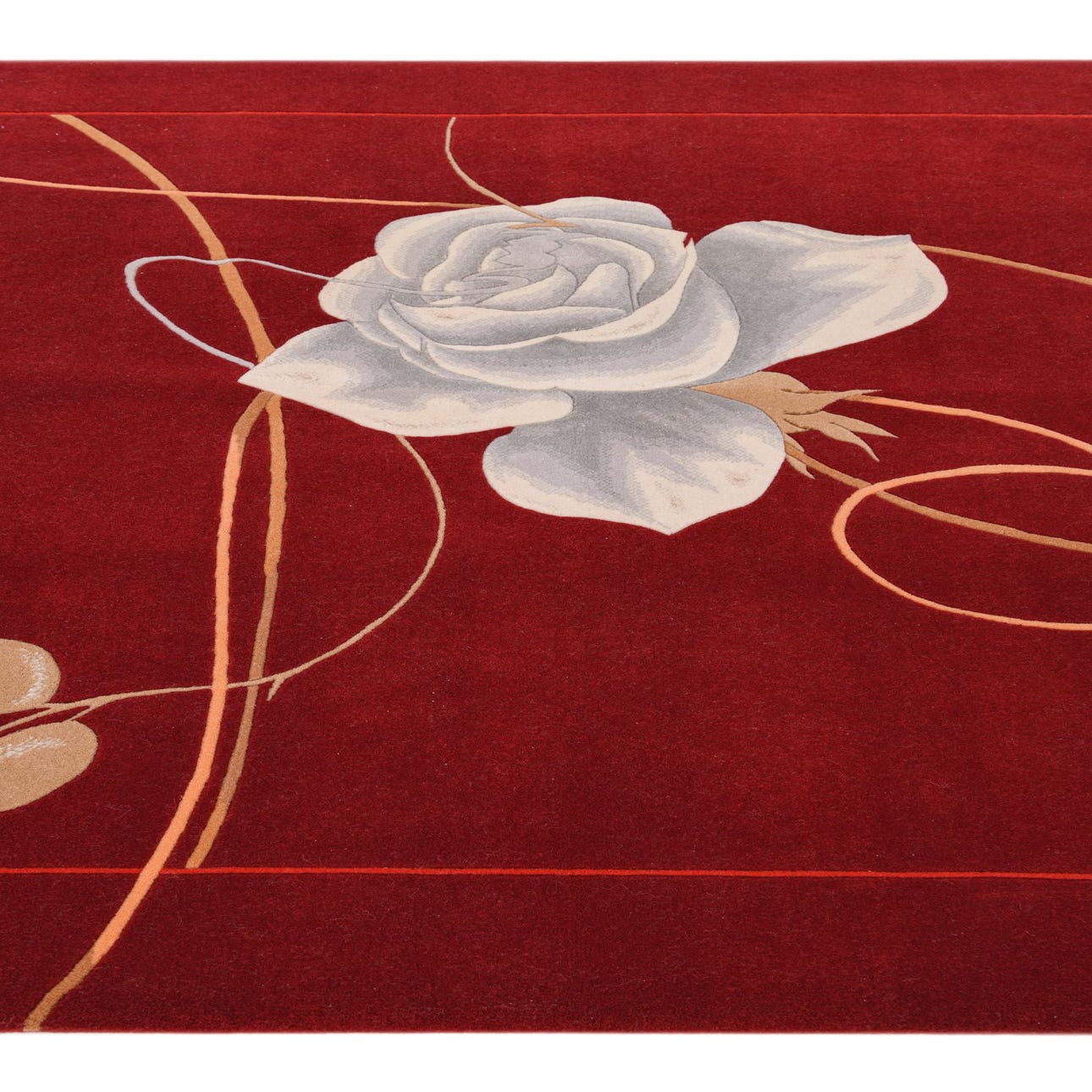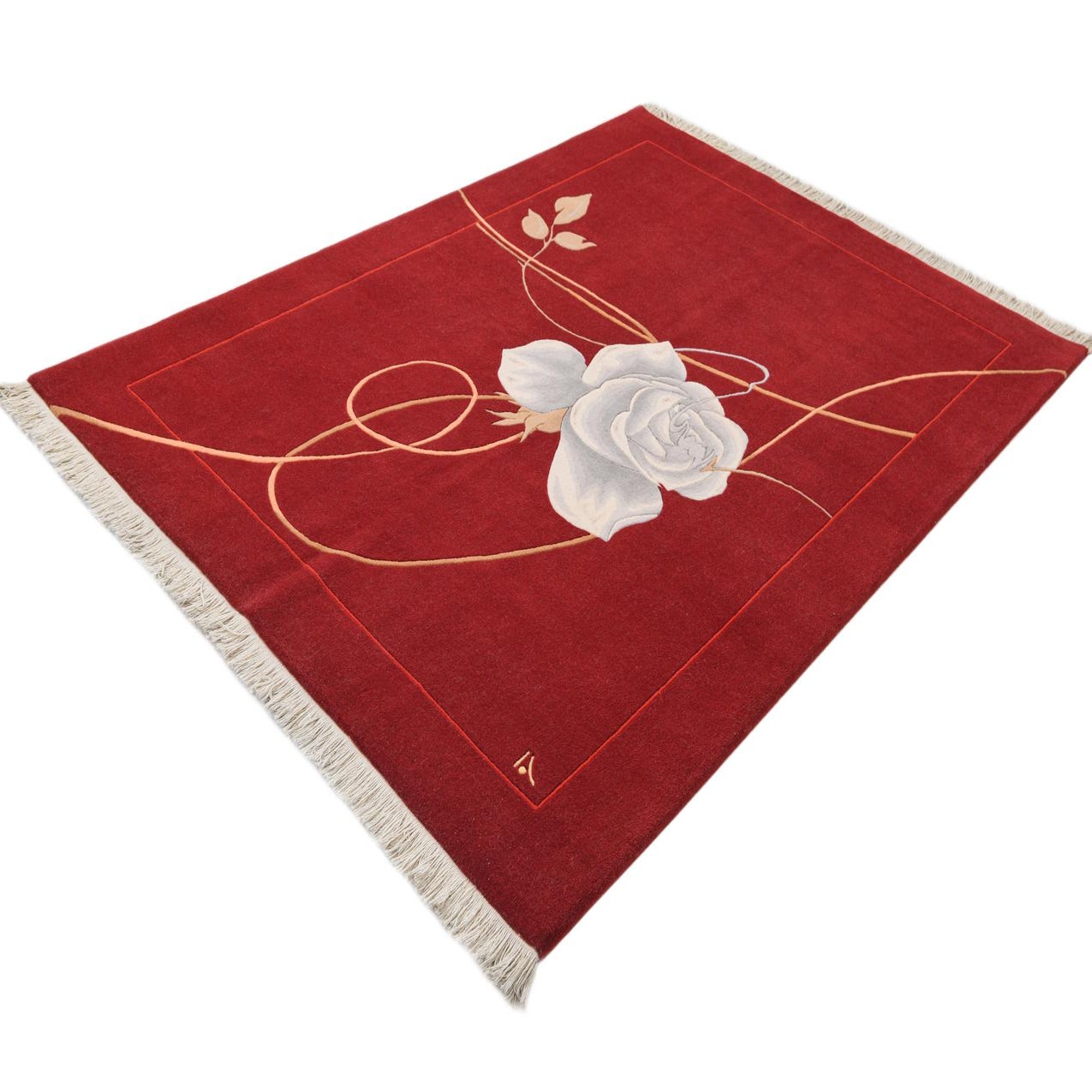 A 5x8 rectangular Darya rug in deep red, featuring a large white rose and gold swirling vines with leaves.
