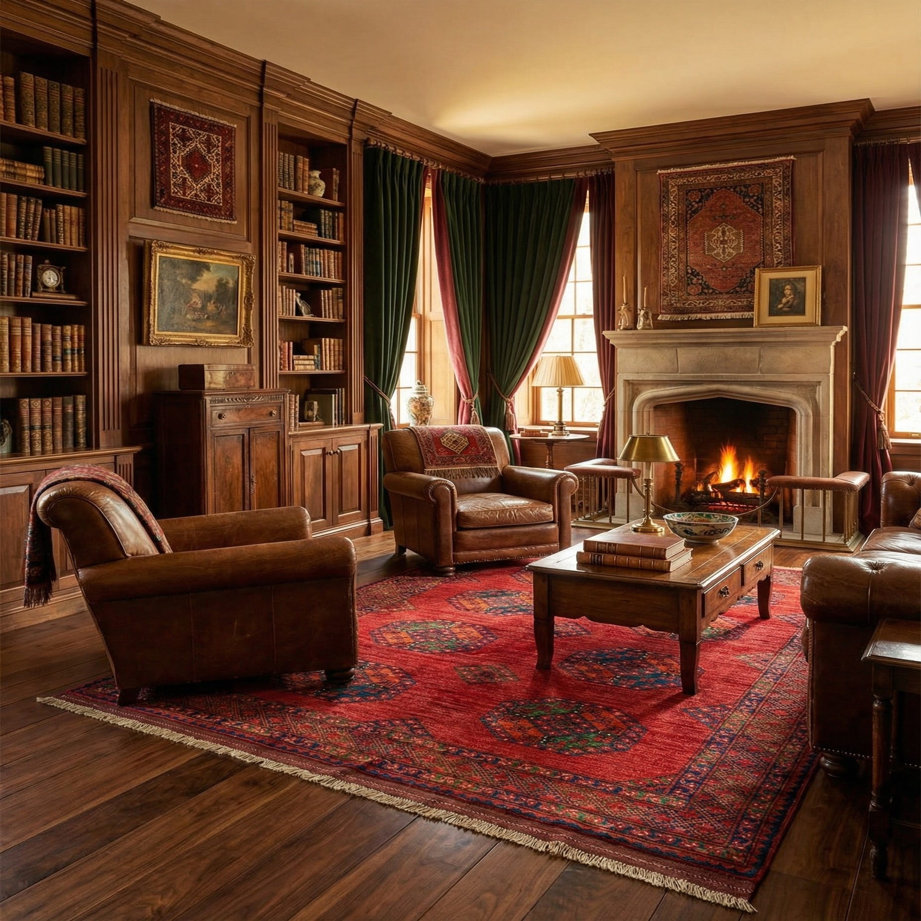 A 5x8 rectangular red Ersari Afghan rug with a tribal Persian pattern and intricate octagonal medallions.