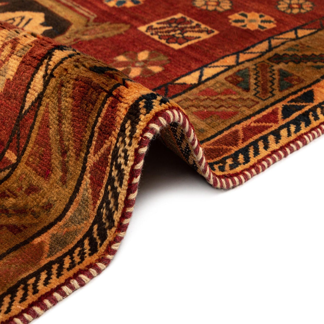 This hand-made Gabbeh wool rug presents a bold and cultural aesthetic, grounded in a palette of deep red as the background. The design features stylized human figures and an array of traditional geometric motifs and botanical elements. Hues of brown, orange, olive, dark blue, and grey emerge throughout, creating a harmonious and striking contrast against the red backdrop. The texture of the rug is enhanced by the high-quality wool, providing both durability and a soft underfoot experience.