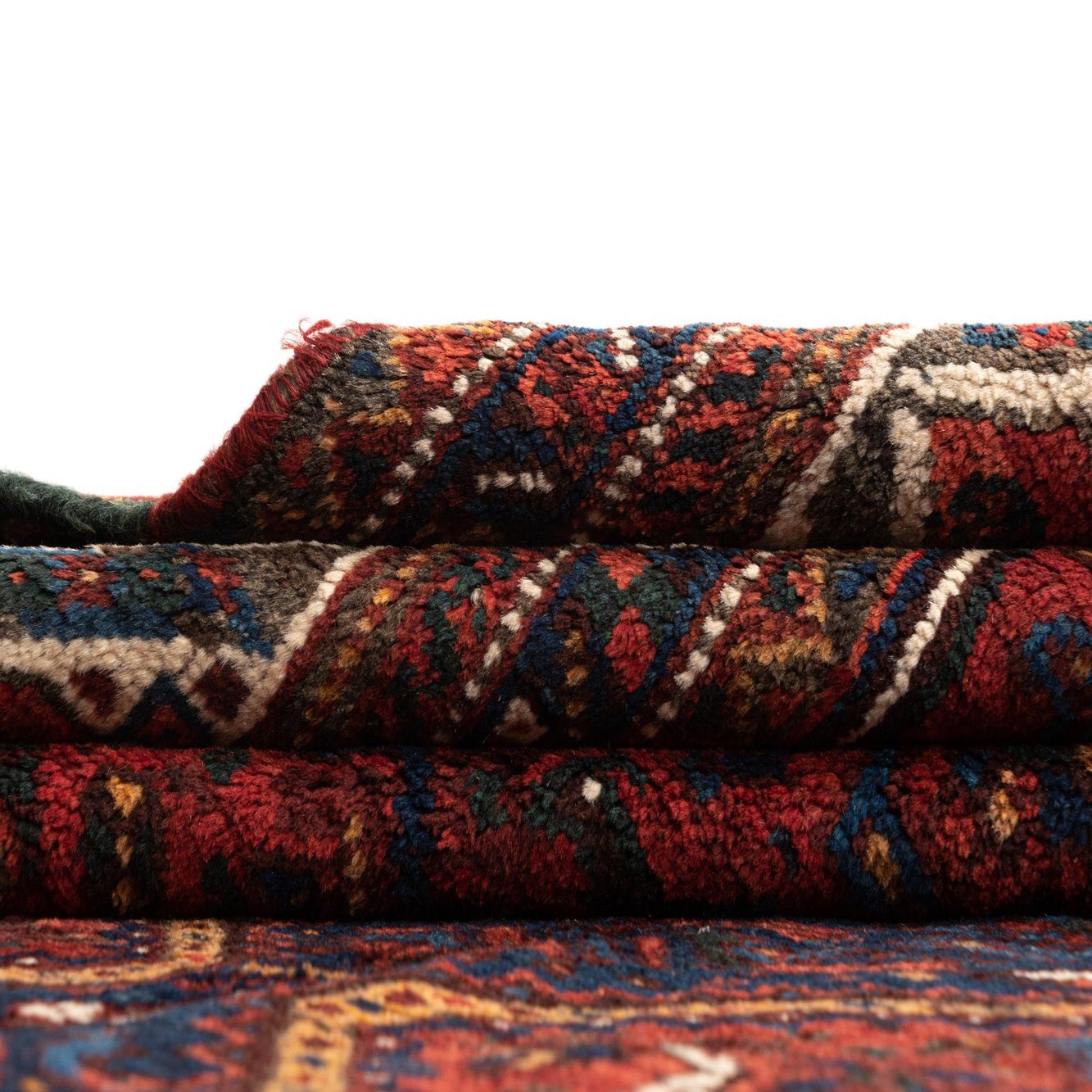 Primary color is Red. Colors in this rug include: Red, Red, Dark Blue, Brown, Cream, Green, Orange.