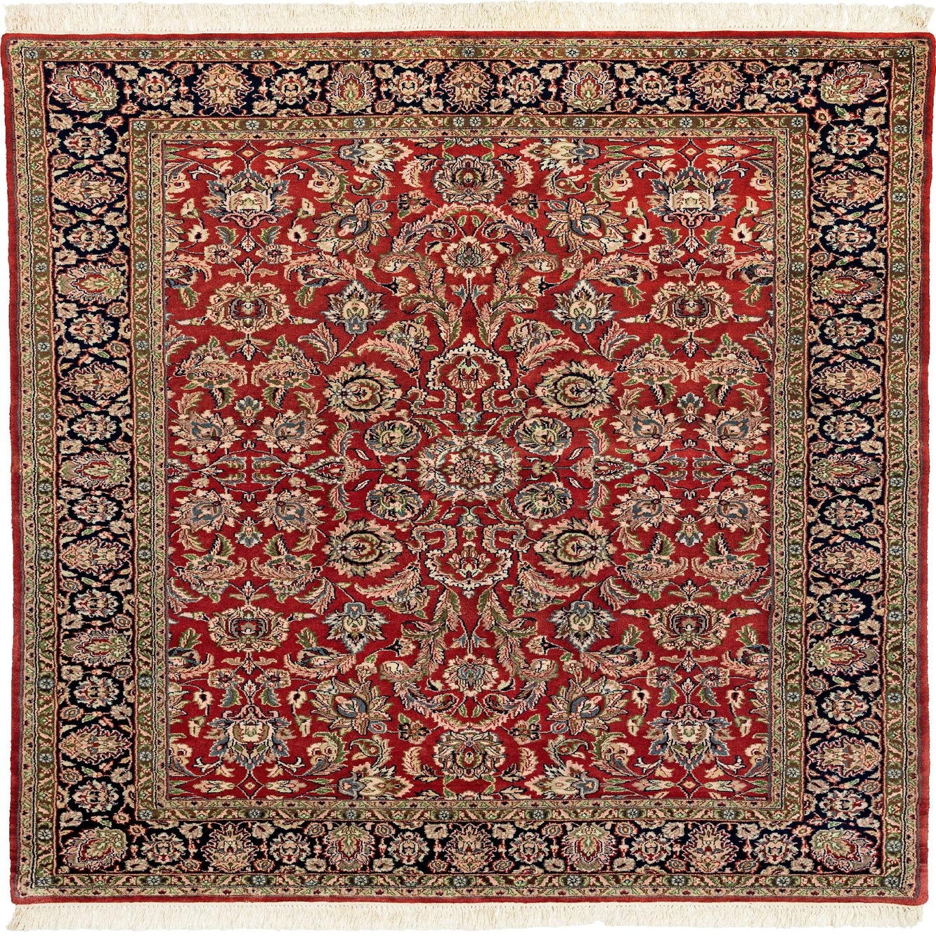 A 5x8 rectangular Isfahan rug featuring a rich red field with an intricate floral pattern and a dark navy border.