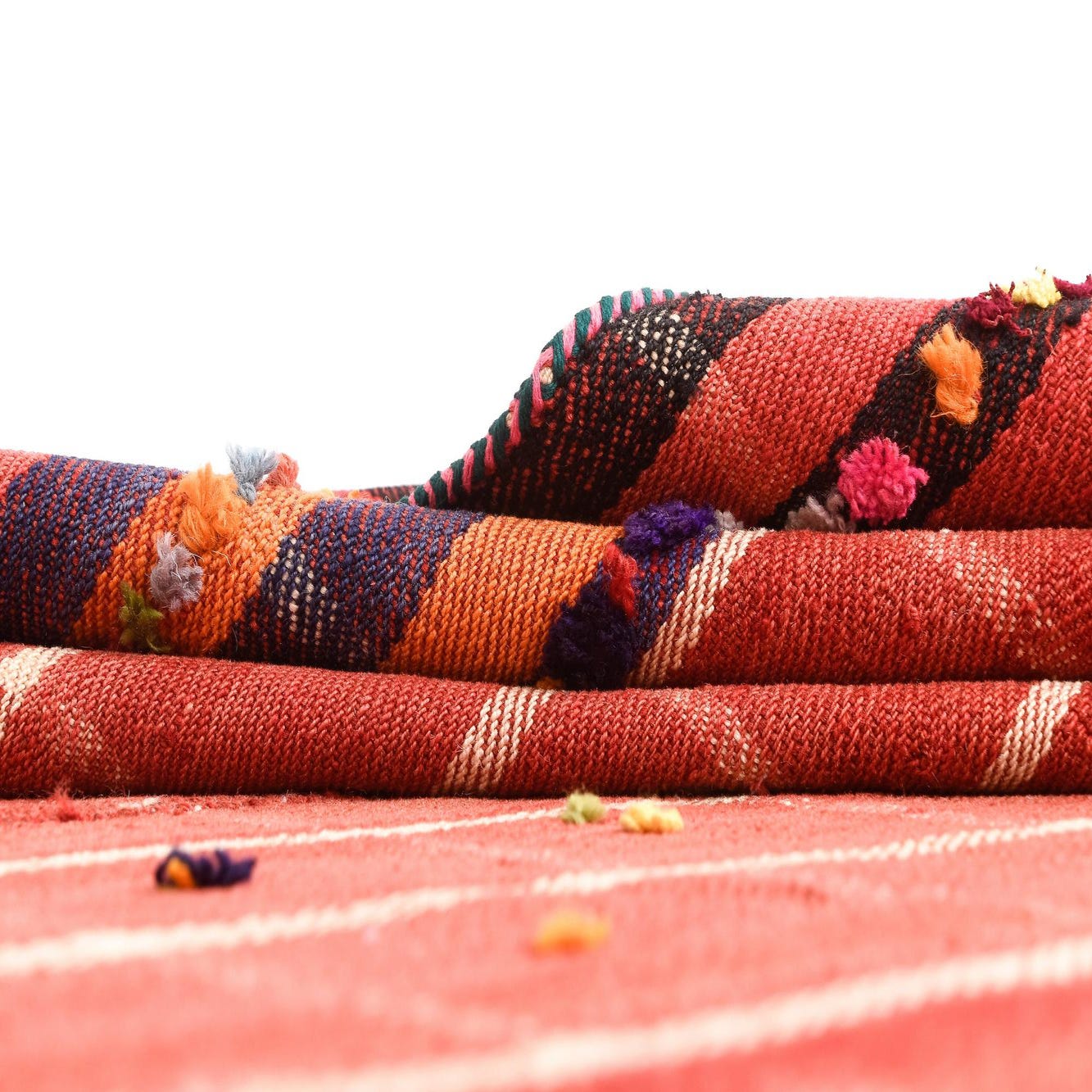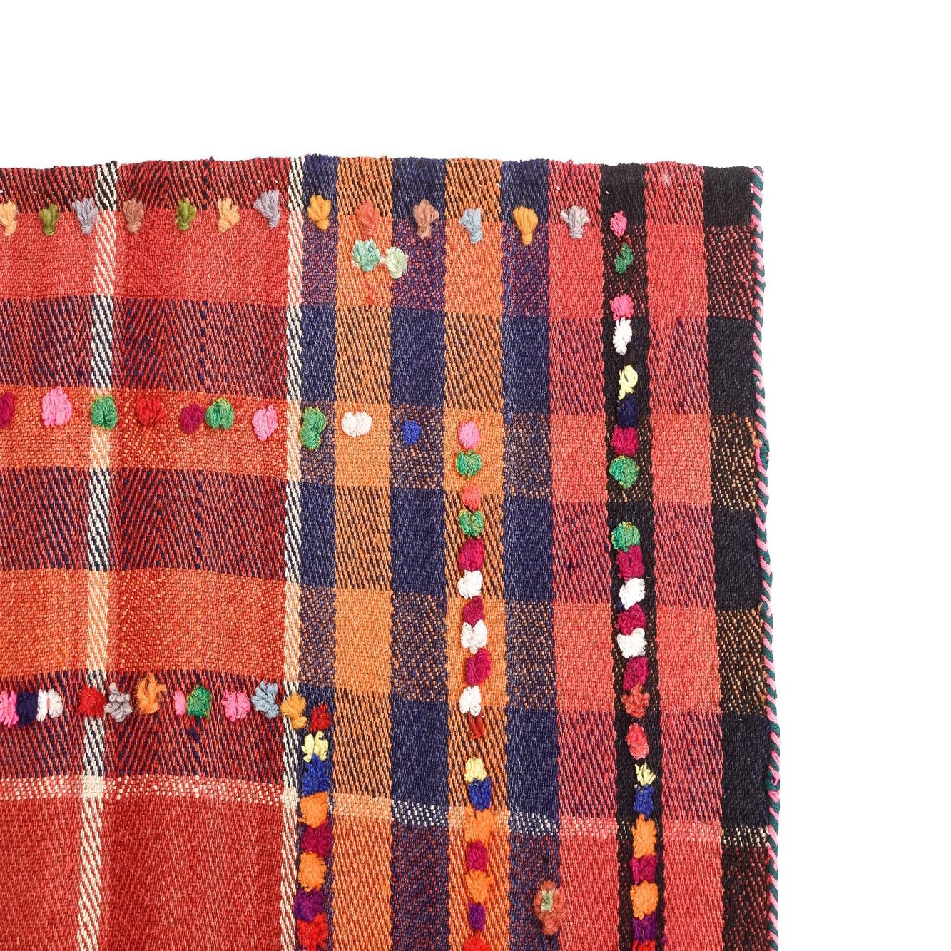 A 5x8 rectangular Jajim rug featuring a red plaid pattern with colorful pom-pom accents and striped borders.