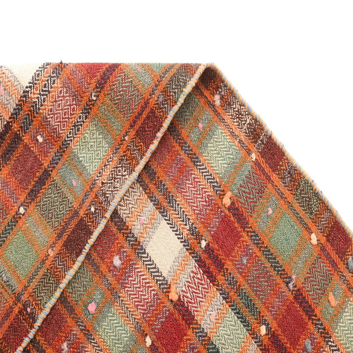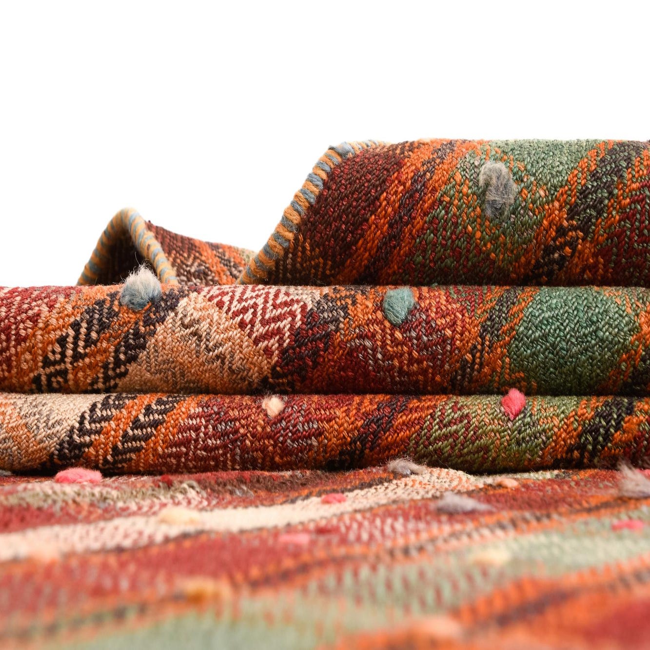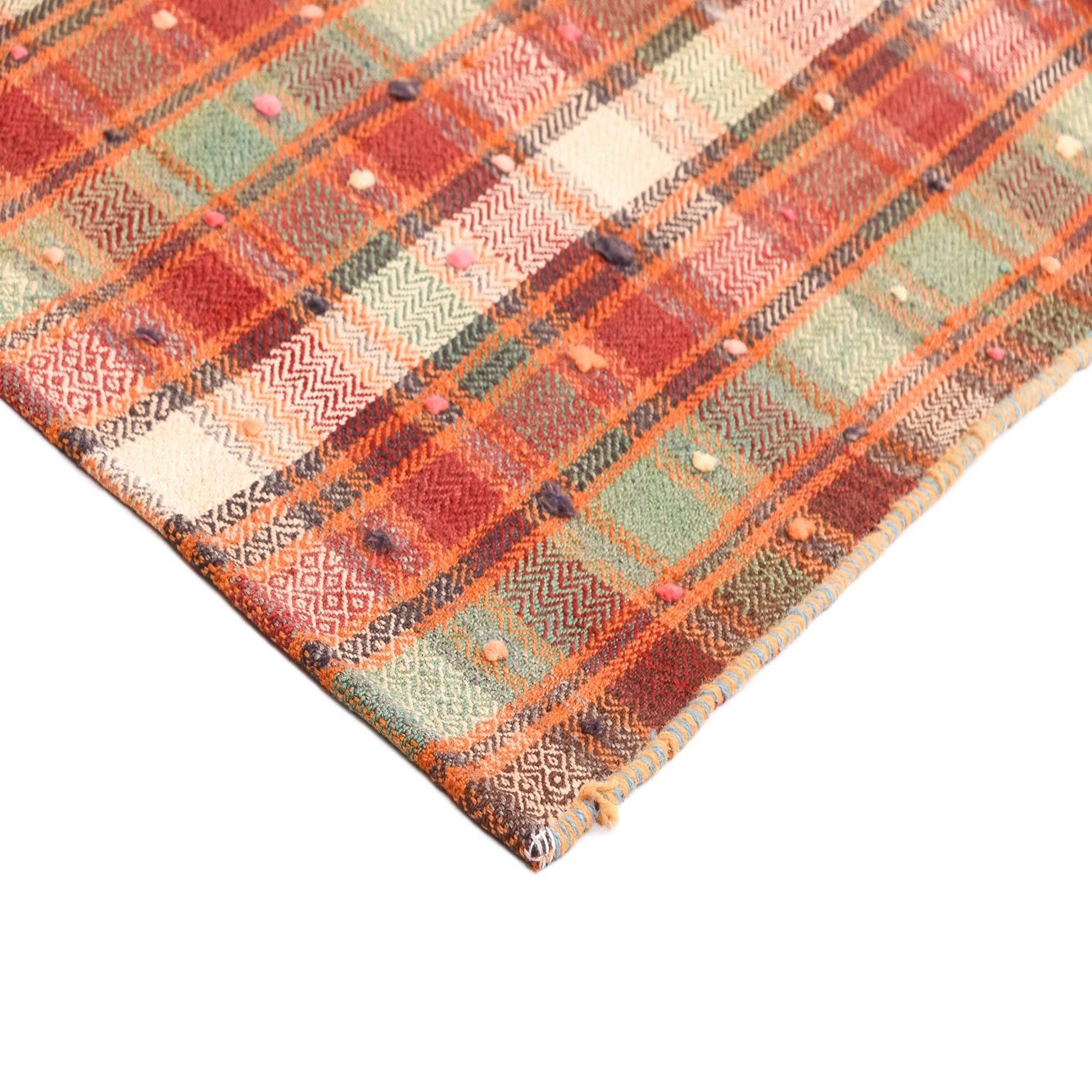 A 5x8 rectangular Jajim rug in a Persian plaid pattern with dominant reds, greens, and cream, featuring colorful speckled accents.