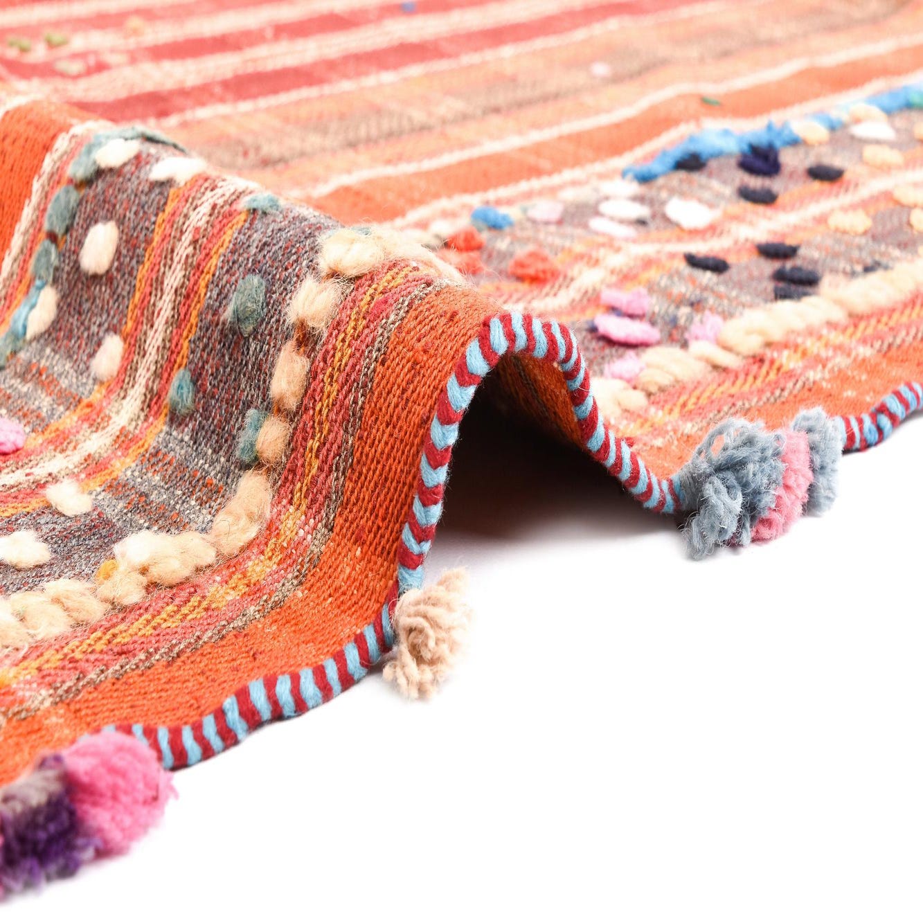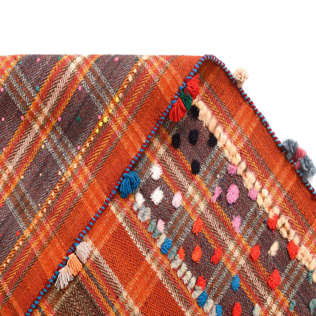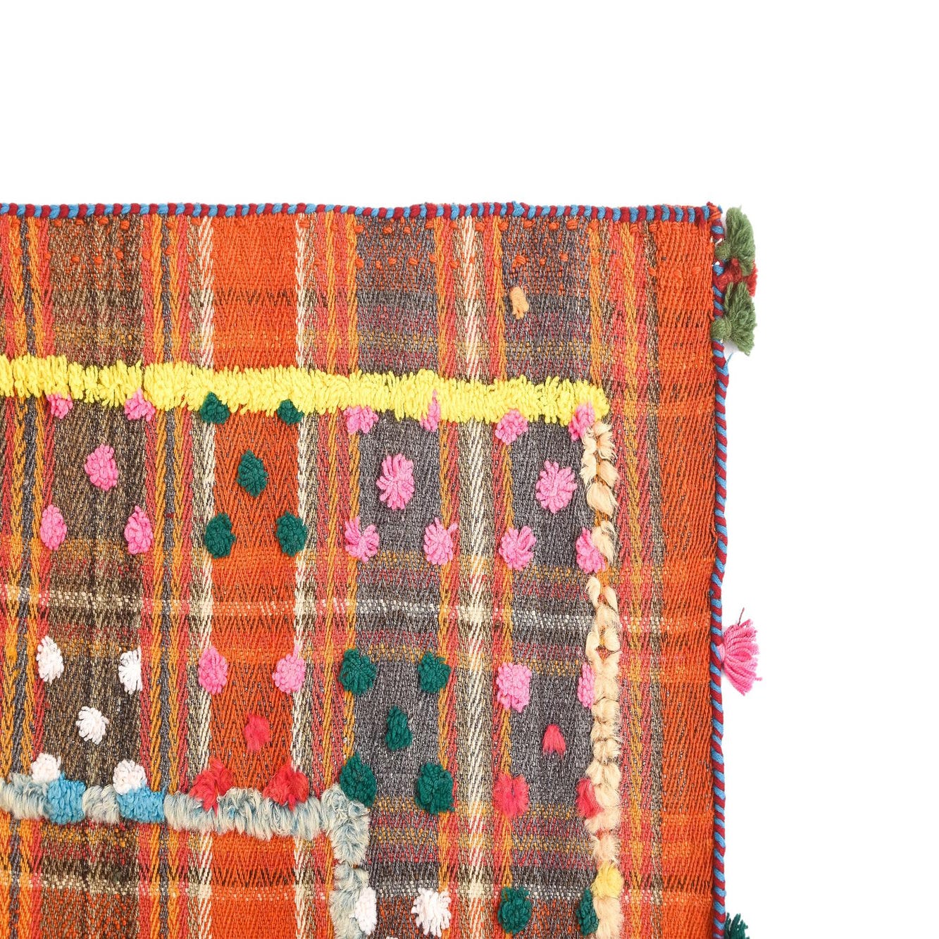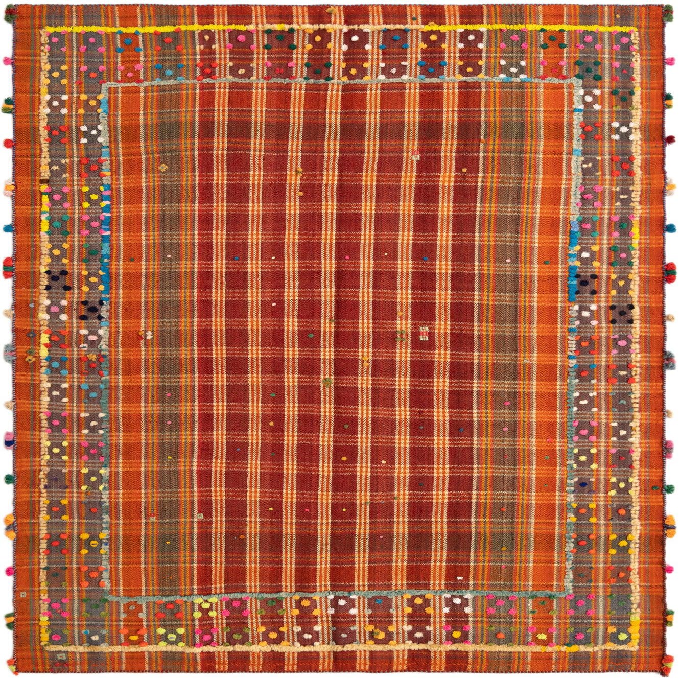 A hand-made wool rug with a warm red ground, this piece presents a classic checked field woven from intersecting stripes in rust, orange and muted gold. The central plaid is given lively contrast by a narrow, multicolored border dotted with small, playful colored tufts and pom accents in pink, yellow, teal, blue and green. The weave sits low and compact, offering a firm, tactile surface with a slightly rustic, handcrafted character that feels substantial underfoot.