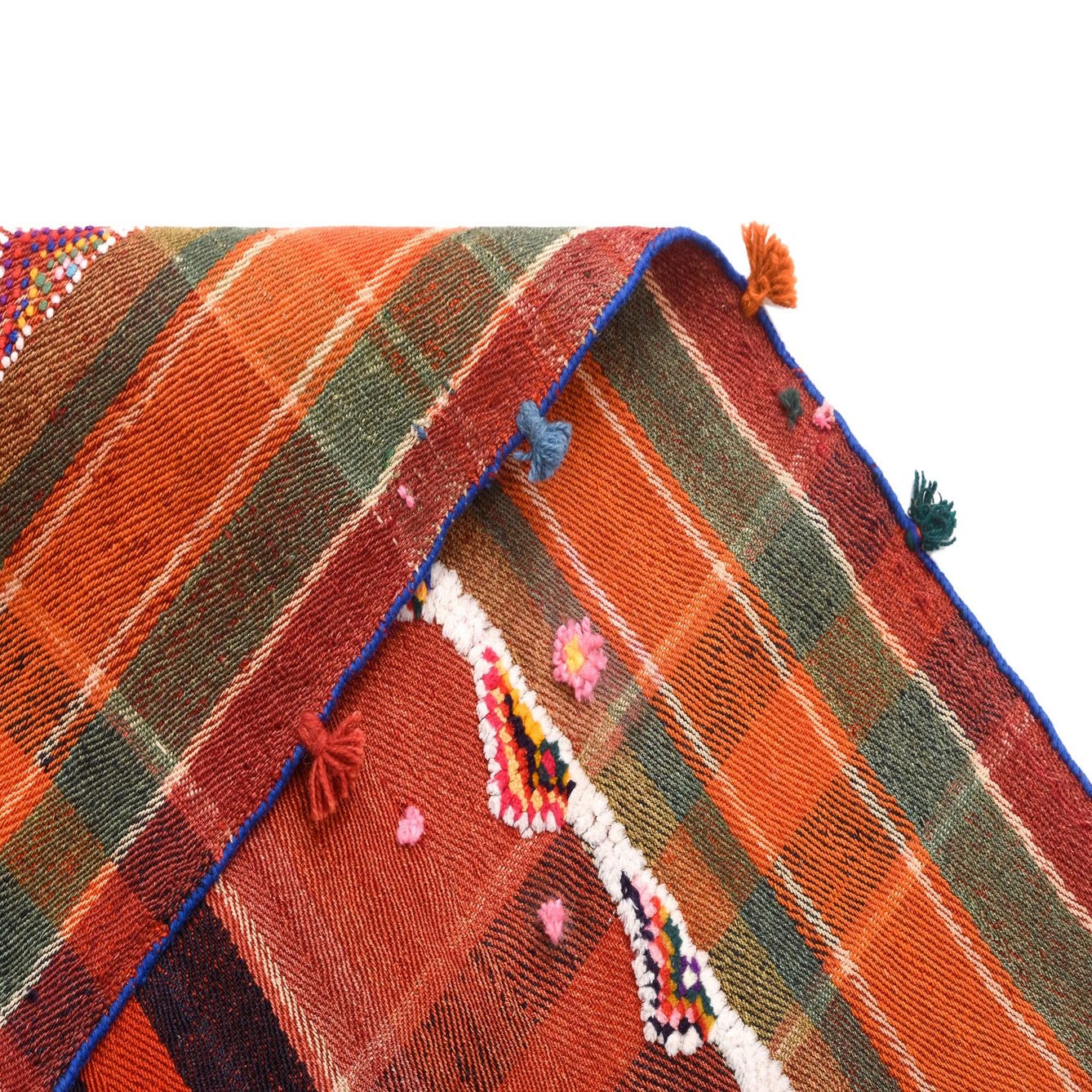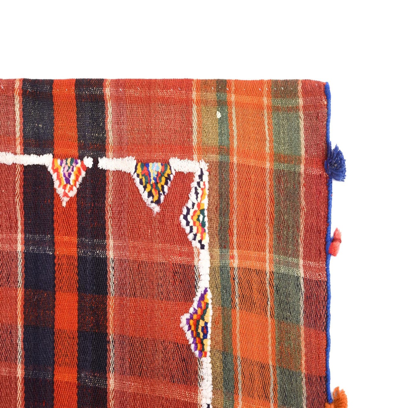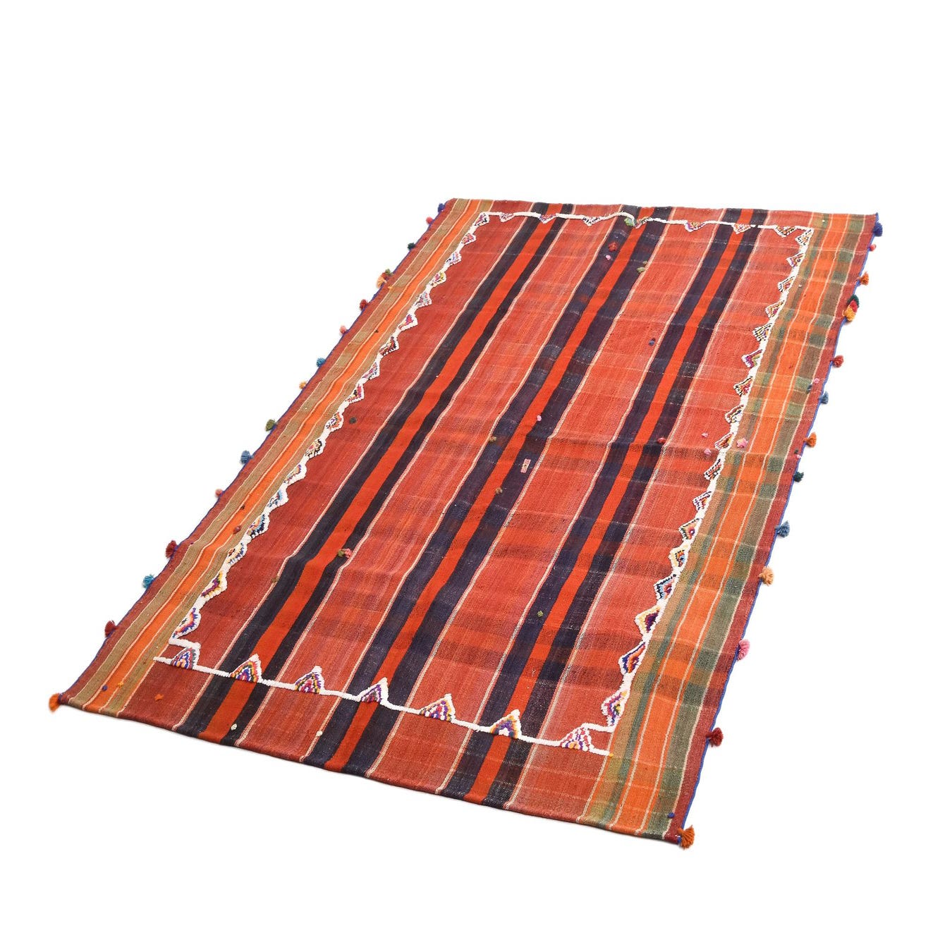 The Jajim collection presents a hand-made wool 5x8 rug distinguished by a dominant red background, punctuated by bold horizontal stripes that introduce shades of black, orange, and brown to its color palette. This piece showcases a series of intricate white embroidered designs along its borders, adding a subtle decorative touch, while the playful tassels on its edges inject a casual, whimsical element.