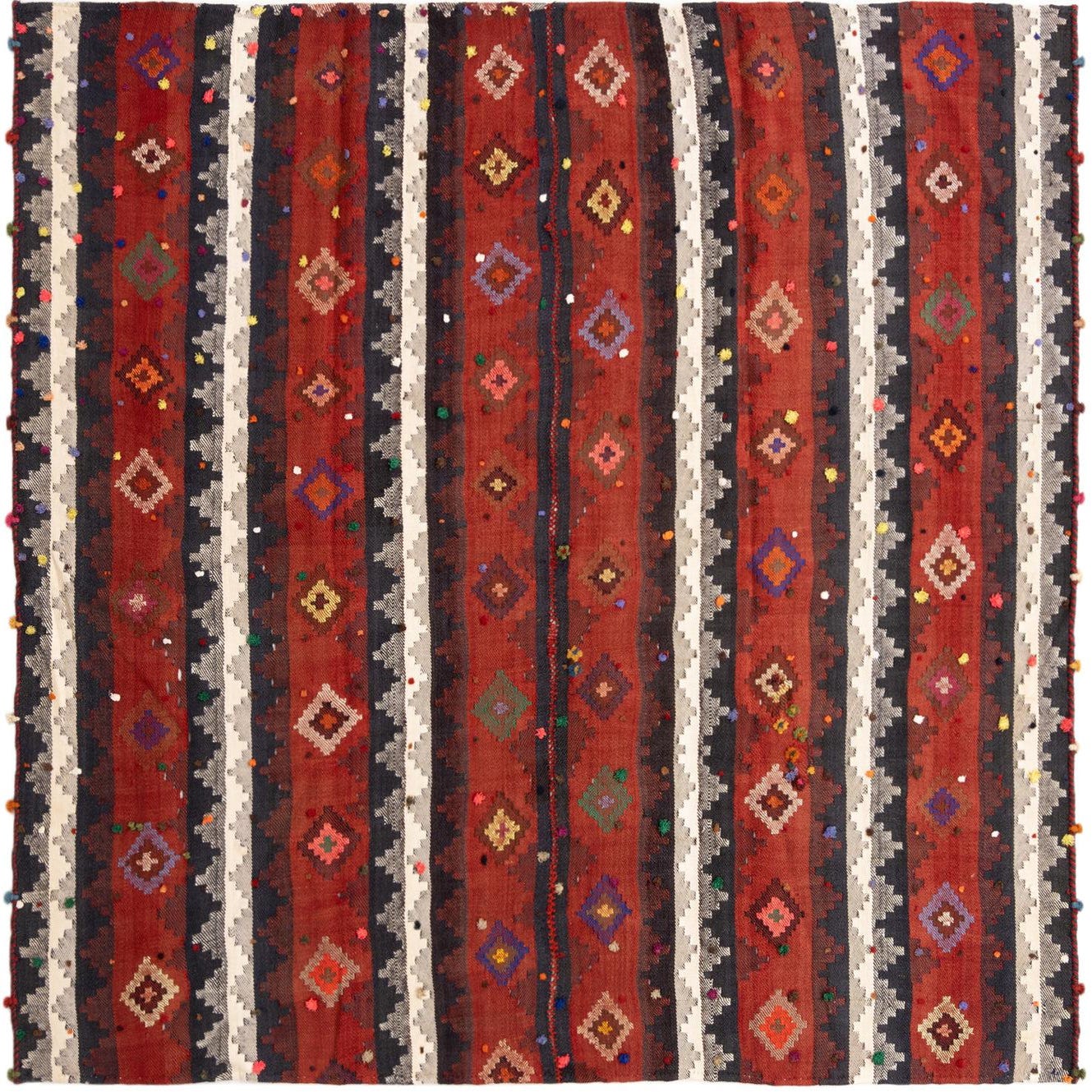 This hand made wool Jajim displays a classic striped layout in a warm red field, punctuated by narrow bands of dark charcoal and cream with stepped edges. Small geometric diamond motifs in rust, orange, purple, green and ivory march down the red stripes, while tiny multicolored knots and tufts add playful, tactile dots across the surface. The flatwoven construction has a firm hand and subtle irregularities that reflect traditional weaving techniques, giving the rug a low, textured feel underfoot rather than a plush pile.