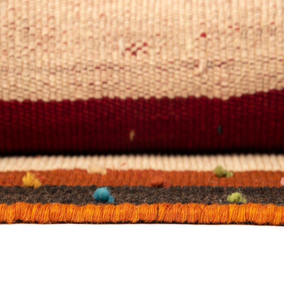 The Jajim collection presents a hand-made 5x8 rug crafted from 100% wool, showcasing a compelling linear pattern. This piece features a rich red background accented with bold vertical stripes in a harmonious palette that includes black, burnt orange, and natural beige tones. The added intrigue comes from the playful multicolored dots that are sprinkled across the rug, adding a subtle, whimsical touch to the overall design.