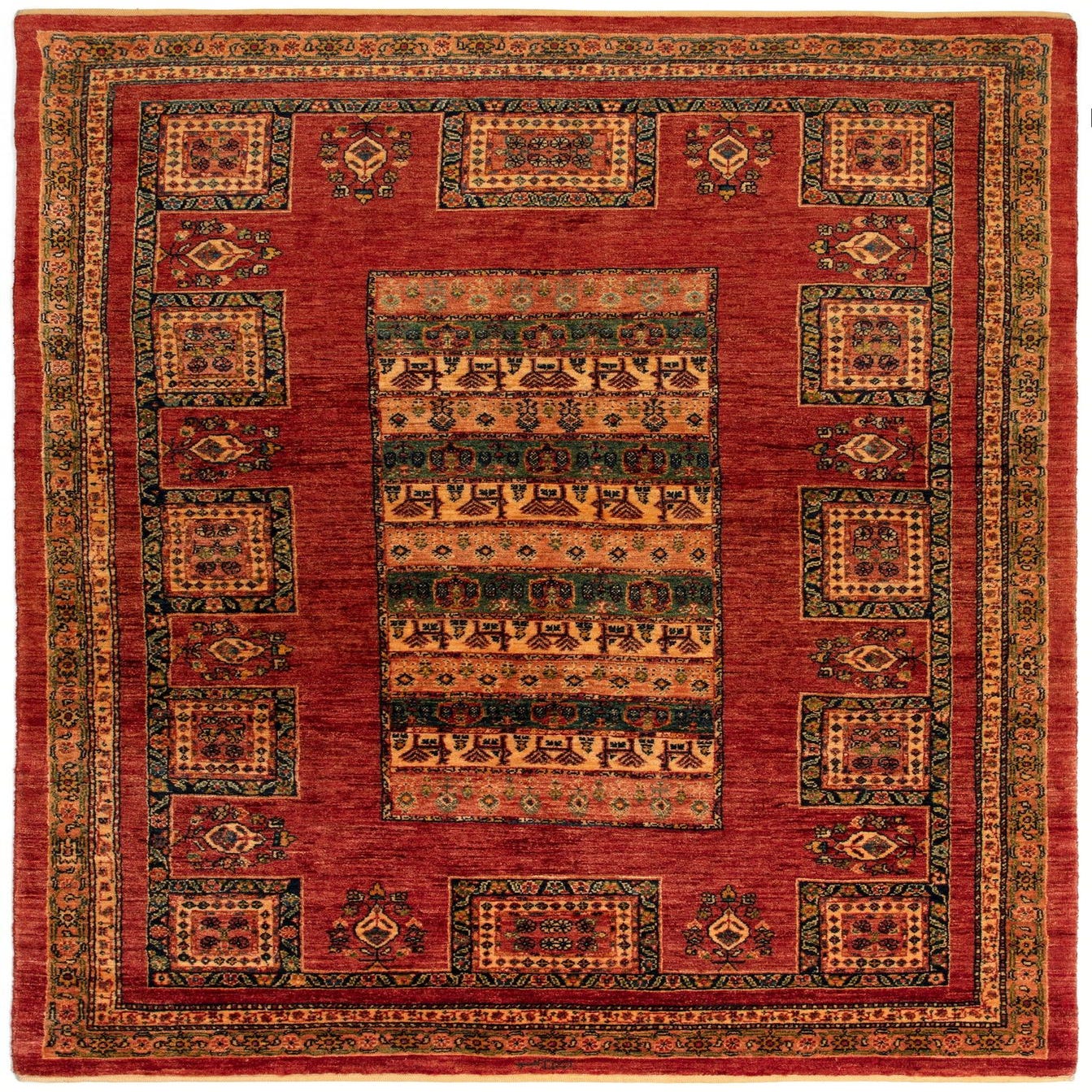 The Kashkuli rug, measuring 5x8, is a handcrafted piece made with a luxurious blend of Kork and Wool. This rug features a rich red background, complemented by an array of intricate patterns in orange, brown, and beige. Its detailed design showcases a series of traditional geometric motifs and border accents that demonstrate the expert craftsmanship of the weavers.