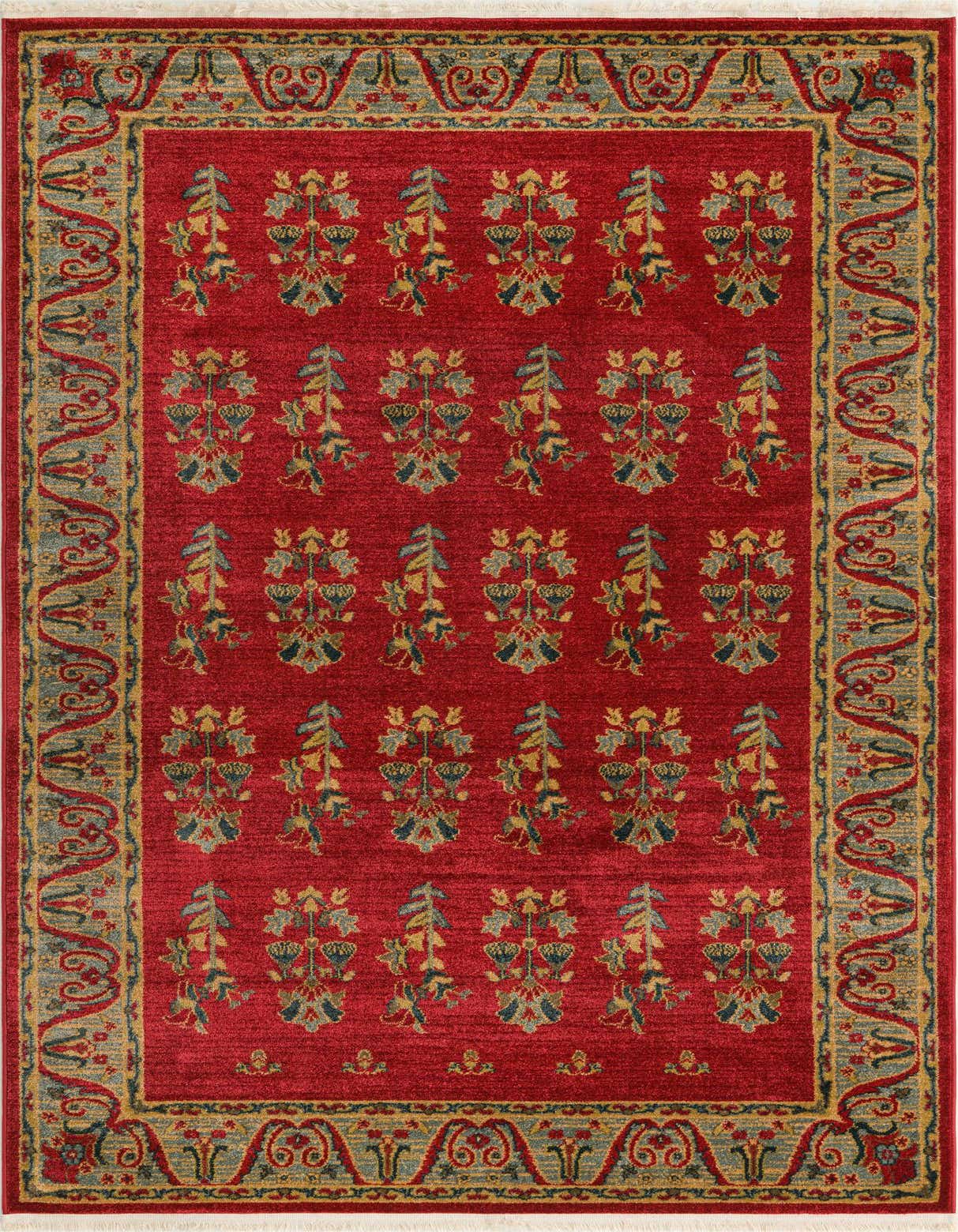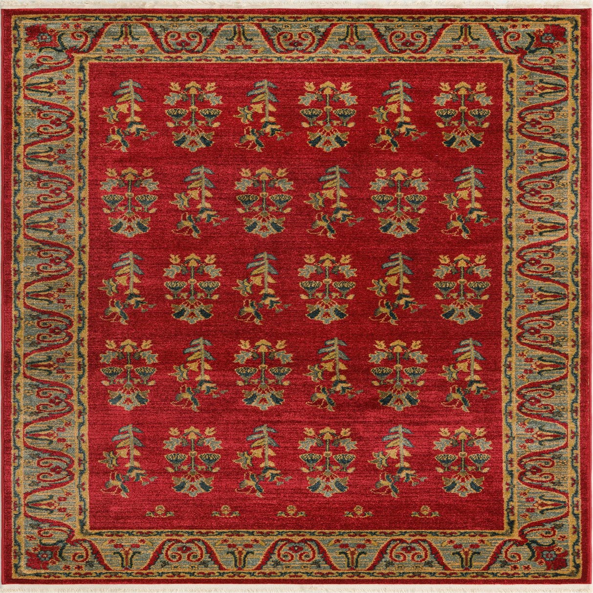 Primary color is Red. Colors in this rug include: Red, Blue, Light Blue, Tan.