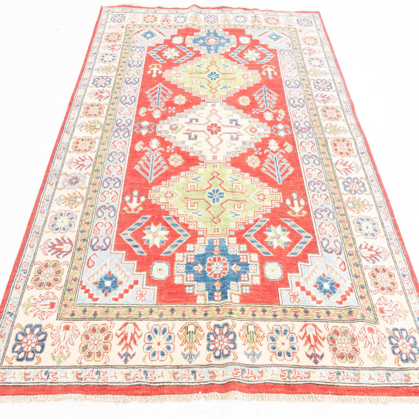 This Kazak collection rug is a true testament to the skilled craftsmanship of hand knotting, crafted from 100% hand-spun wool for a luxurious texture. At 5x8 feet, the piece demonstrates a rich visual harmony, featuring a vibrant red background that anchors a symphony of Beige, Blue, Brown, Cream, Light Blue, and Green hues, deftly complementing each other. Intricate geometric patterns and traditional tribal motifs create a dynamic and cohesive look, brought to completion with the inclusion of tasteful fringes on the shorter ends.