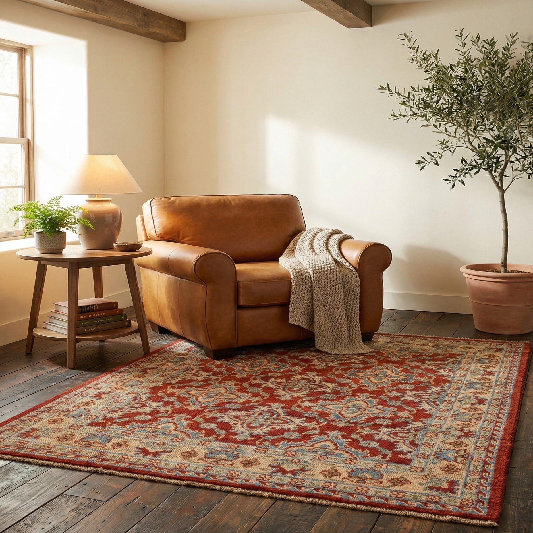 Primary color is Red. Colors in this rug include: Red, Blue, Cream, Olive.