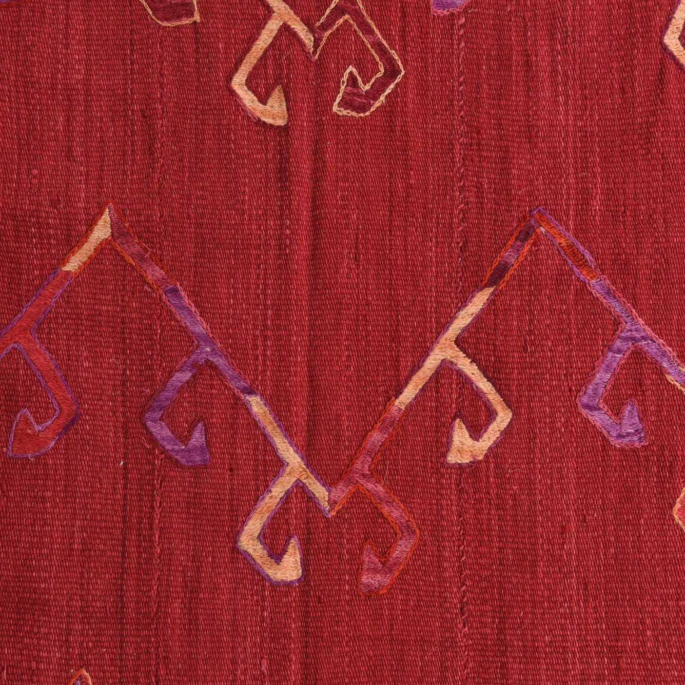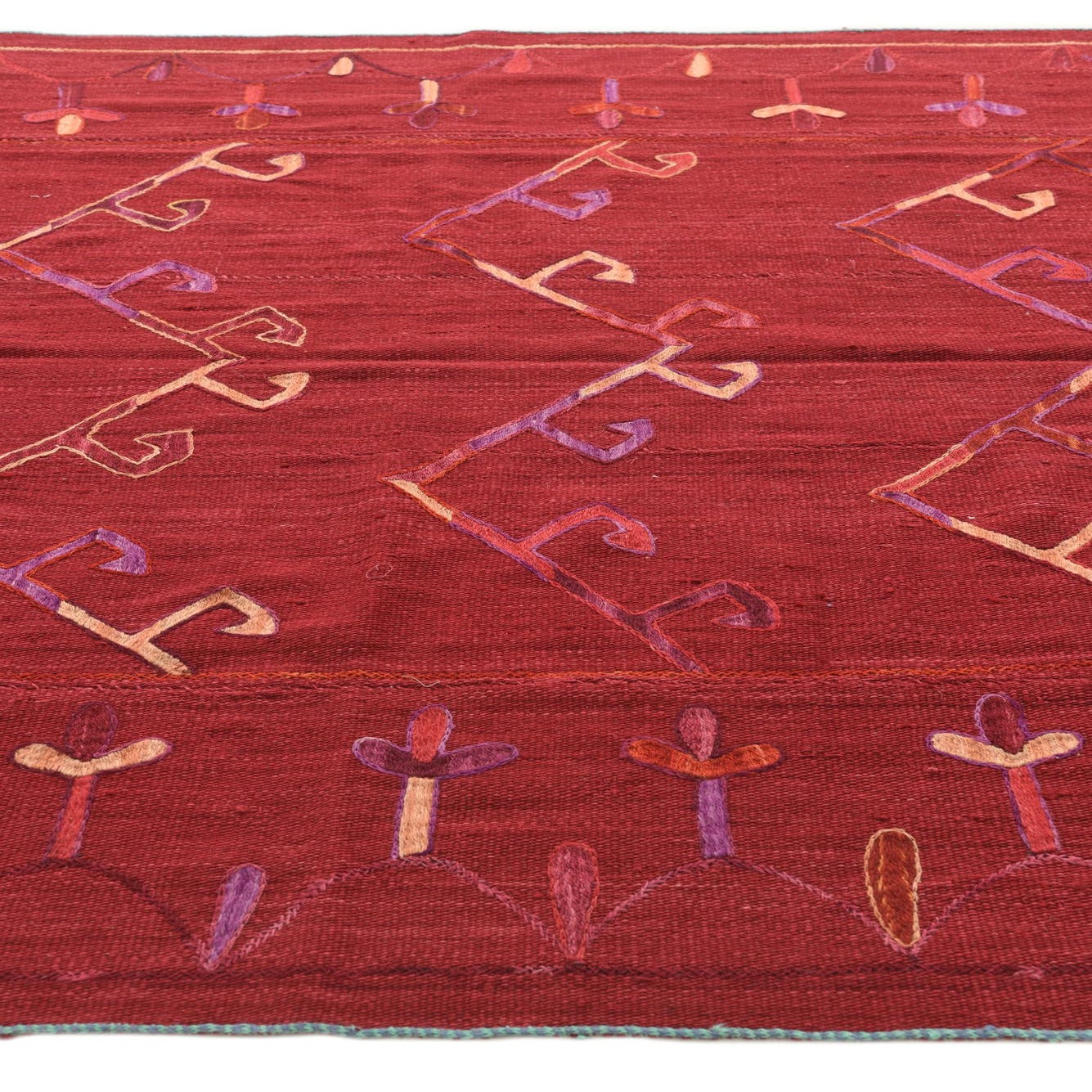 The Kilim Suzani collection presents a hand-woven rug imbued with a rich tapestry of culture and style. This particular 5x8 piece is a testament to skilled craftsmanship, woven from 100% wool for a durable and tactile finish. The rug boasts a vibrant red background complemented by an array of harmonious colors, including beige, orange, purple, and turquoise, creating a visually striking design.