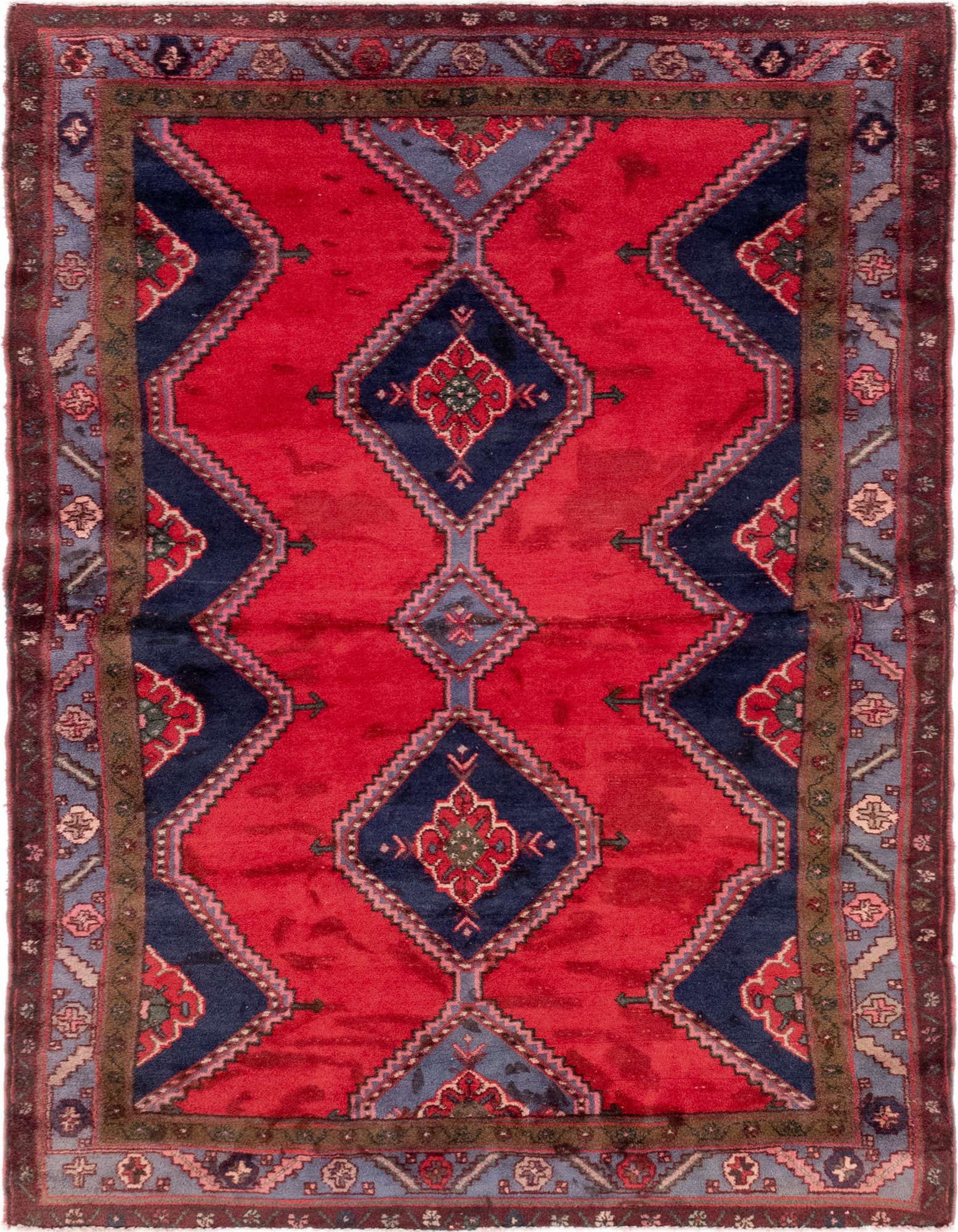 Primary color is Red. Colors in this rug include: Red, Black, Blue, Brown, Burgundy, Green, Ivory, Navy Blue, Pink.