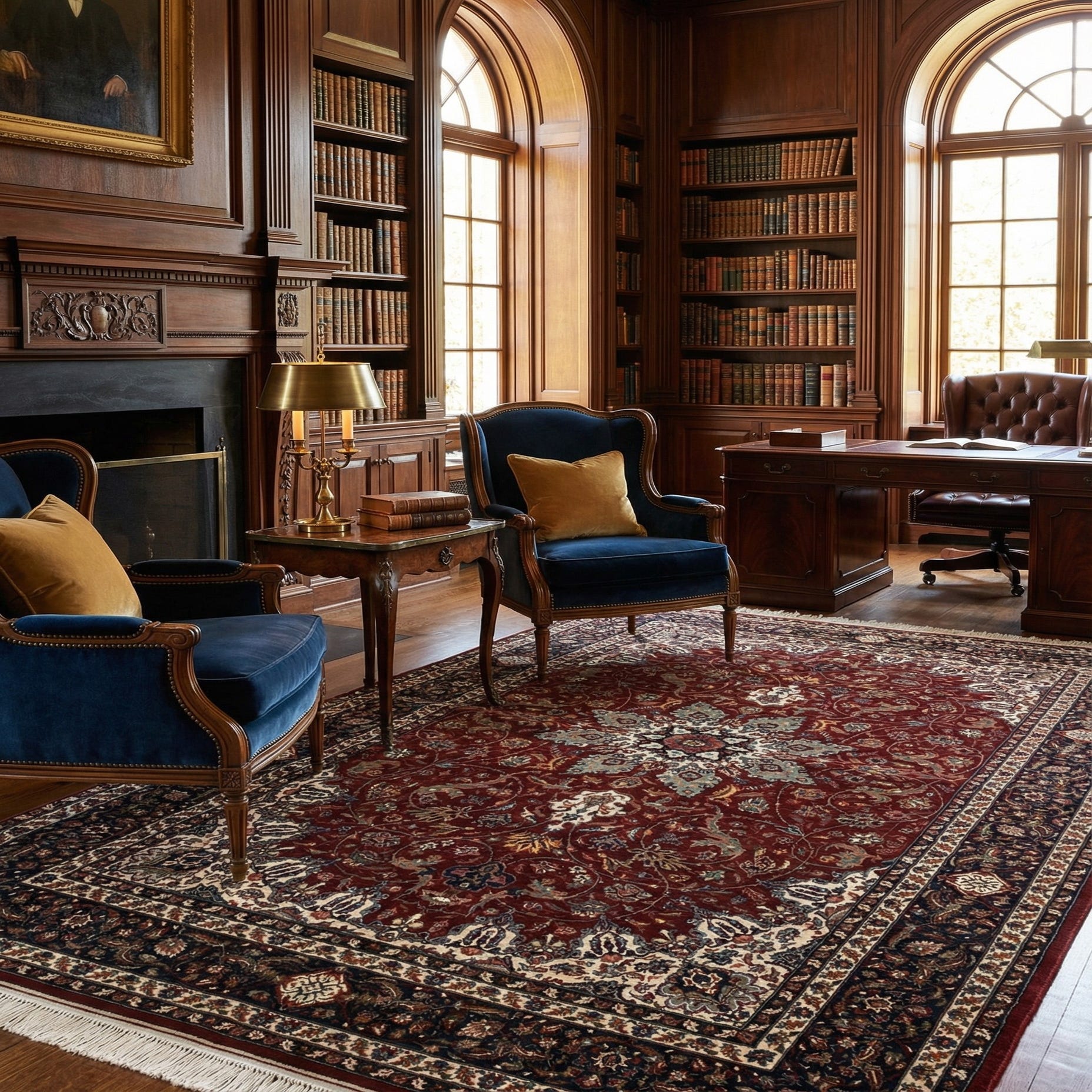 A 5x8 rectangular Lahour traditional wool rug in rich red with intricate floral patterns and dark borders.