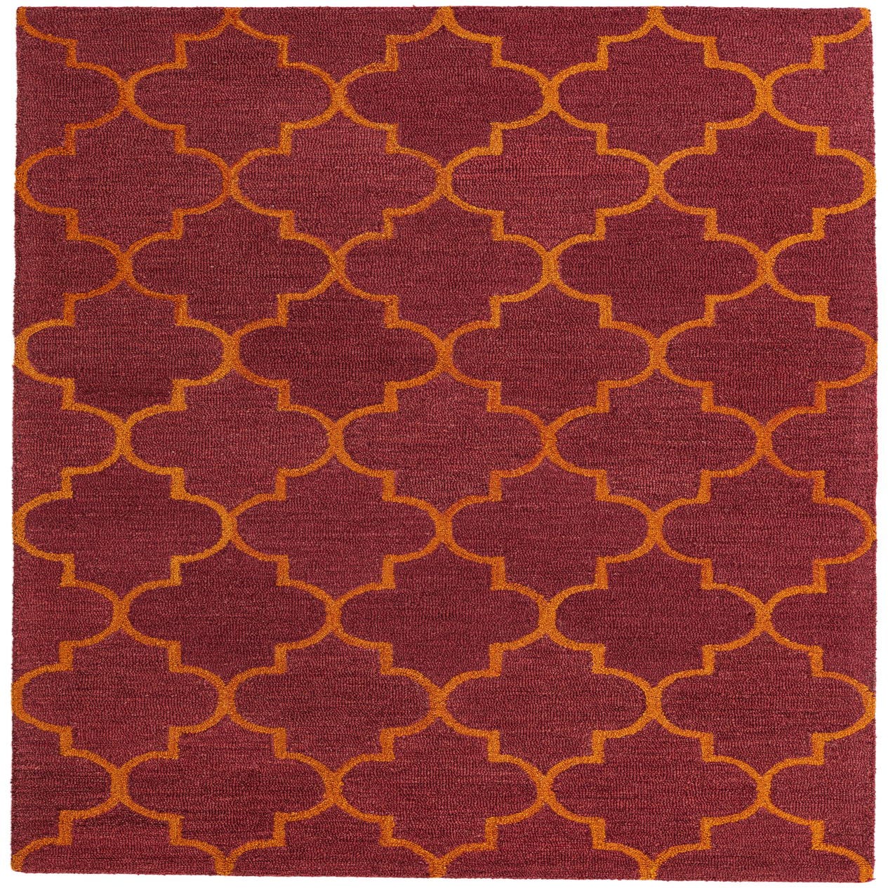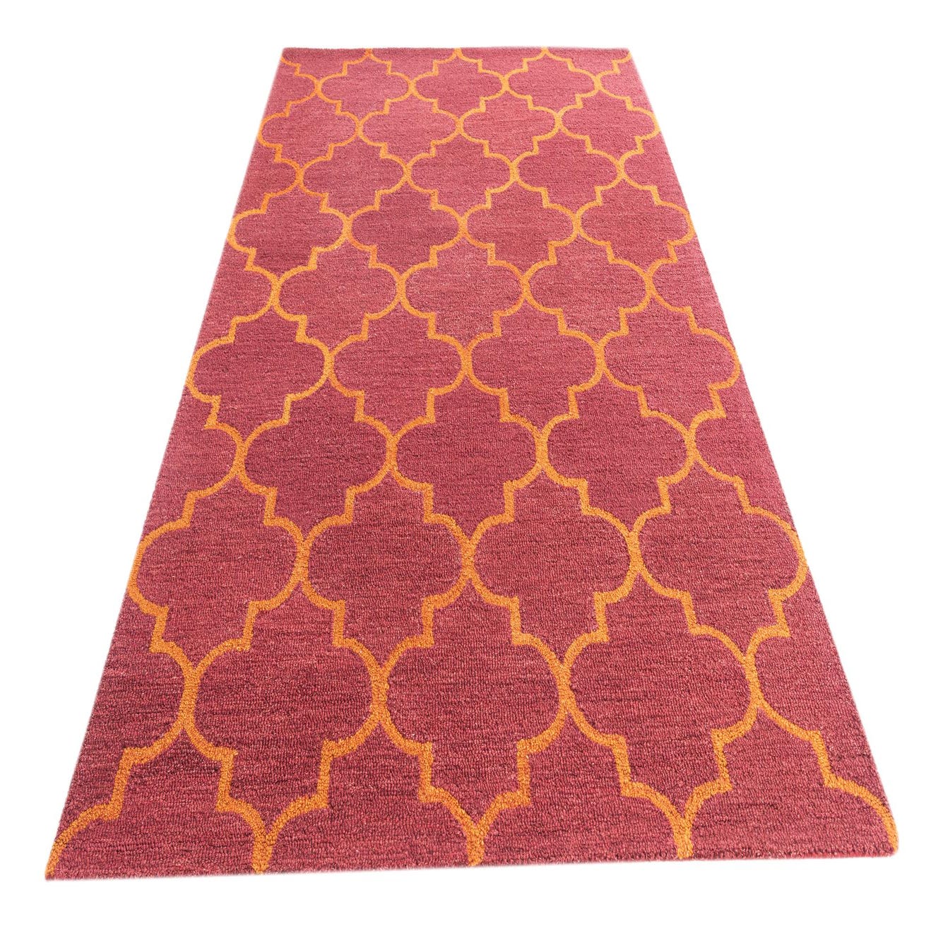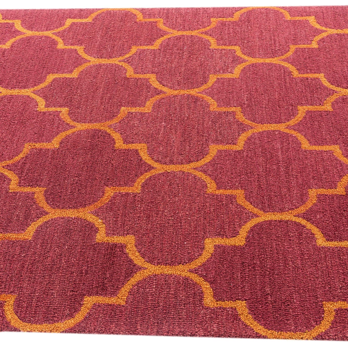 A rich red field sets the stage for a repeating Moroccan-inspired trellis pattern in warm orange. The interlocking motif creates a rhythmic, geometric layout across the surface, while subtle variations in the wool pile add a soft visual depth. Hand-tufted from wool and cotton, the pile has a comfortable, springy hand underfoot and the cotton foundation gives the rug a stable, grounded feel.