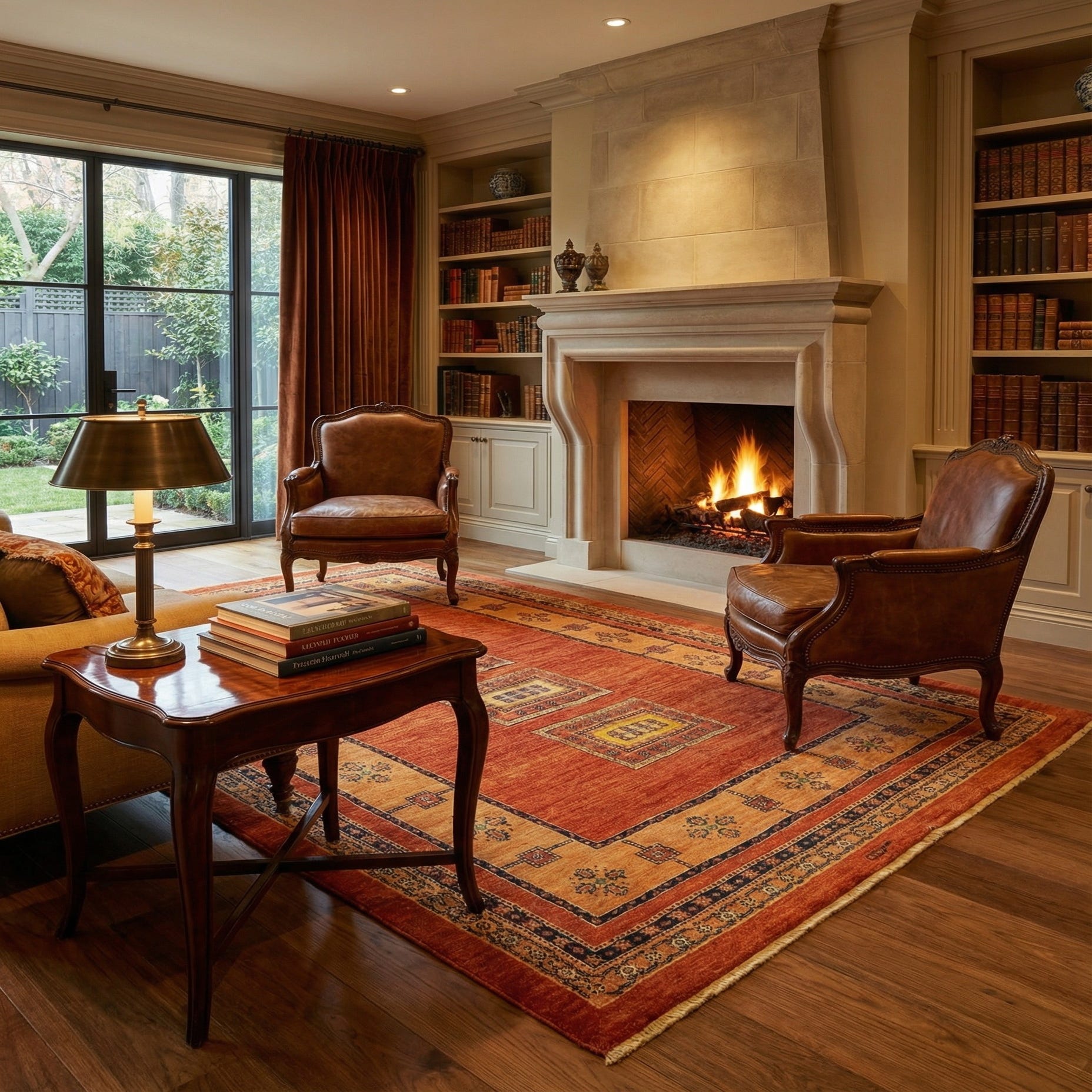 The rug's texture provides a plush, comfortable underfoot experience, underpinned by the high-quality construction and durability synonymous with wool hand-made rugs. The selection of colors and the traditional pattern harmonizes with various interior design styles, from classic to contemporary settings.