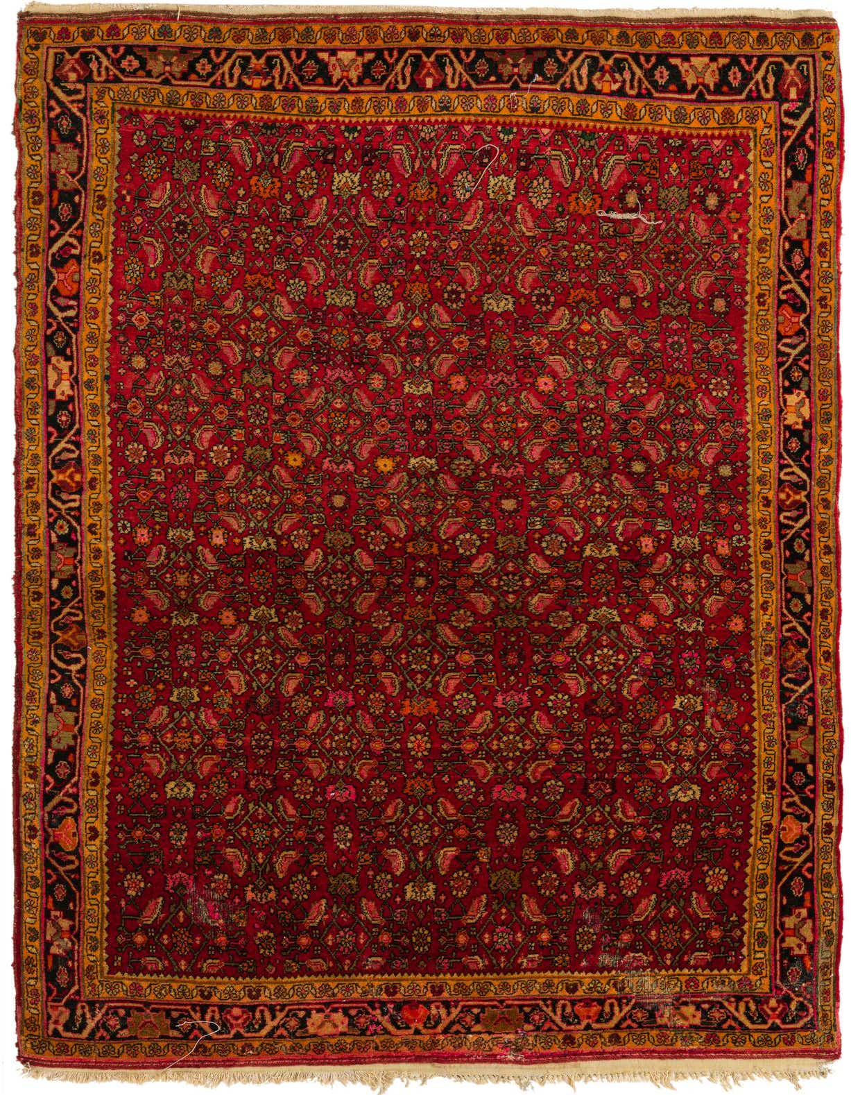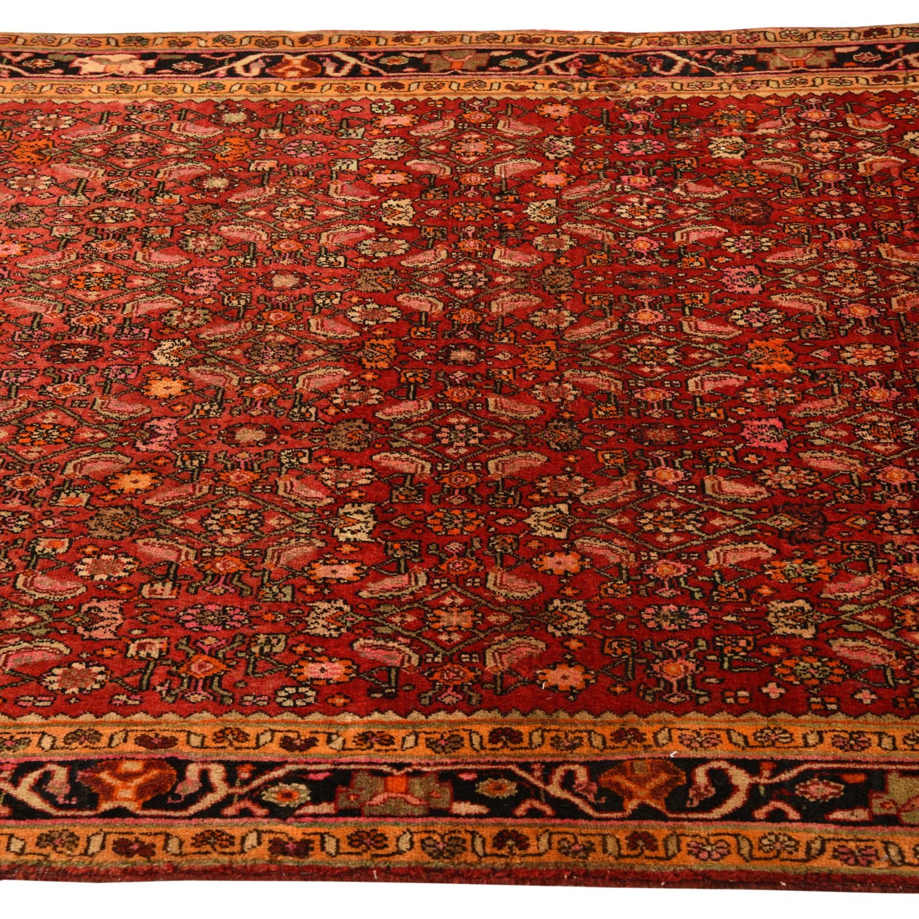 The Malayer collection presents a hand-knotted 5x8 rug crafted from 100% wool, showcasing a robust red background complemented by a diverse color palette including black, orange, green, yellow, and pink. The design features a detailed, intricate pattern with traditional motifs that evoke a sense of time-honored craftsmanship. The texture of the rug is characteristic of hand-knotted wool, offering a tactile richness that adds depth to its visual appeal.
