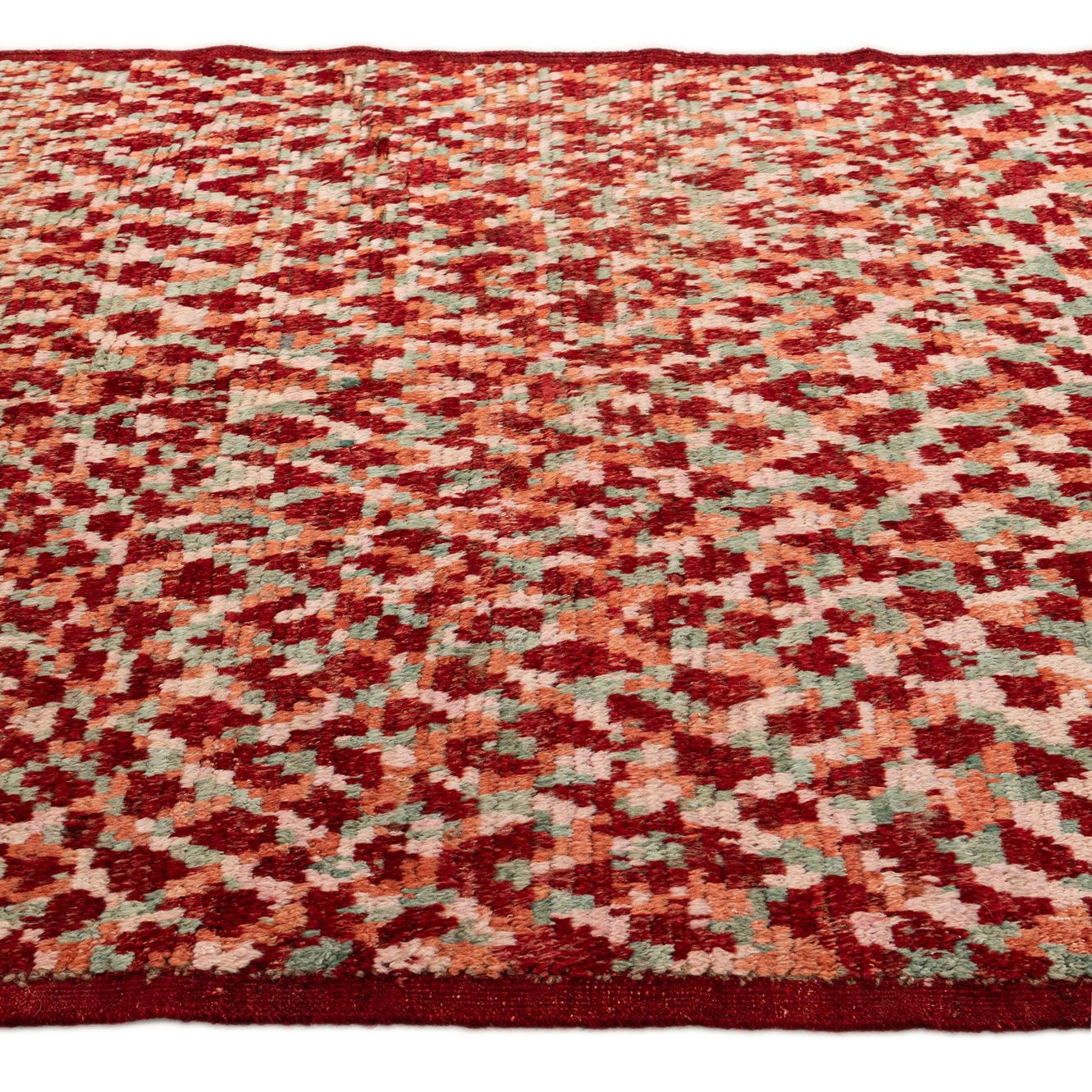 A 5x8 rectangular Moroccan wool rug featuring a modern tribal abstract pattern in varying shades of red, peach, and light green.