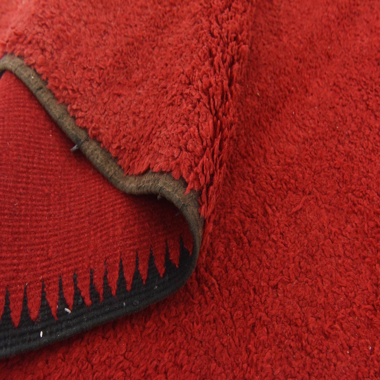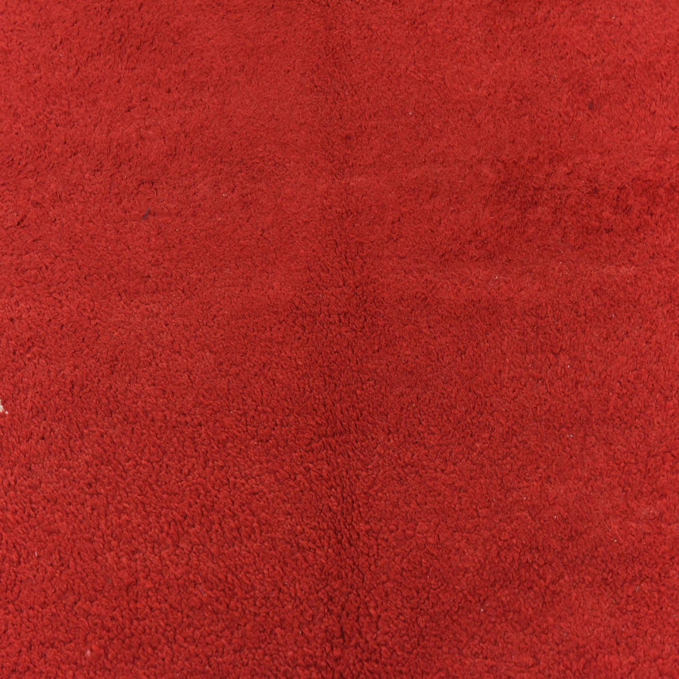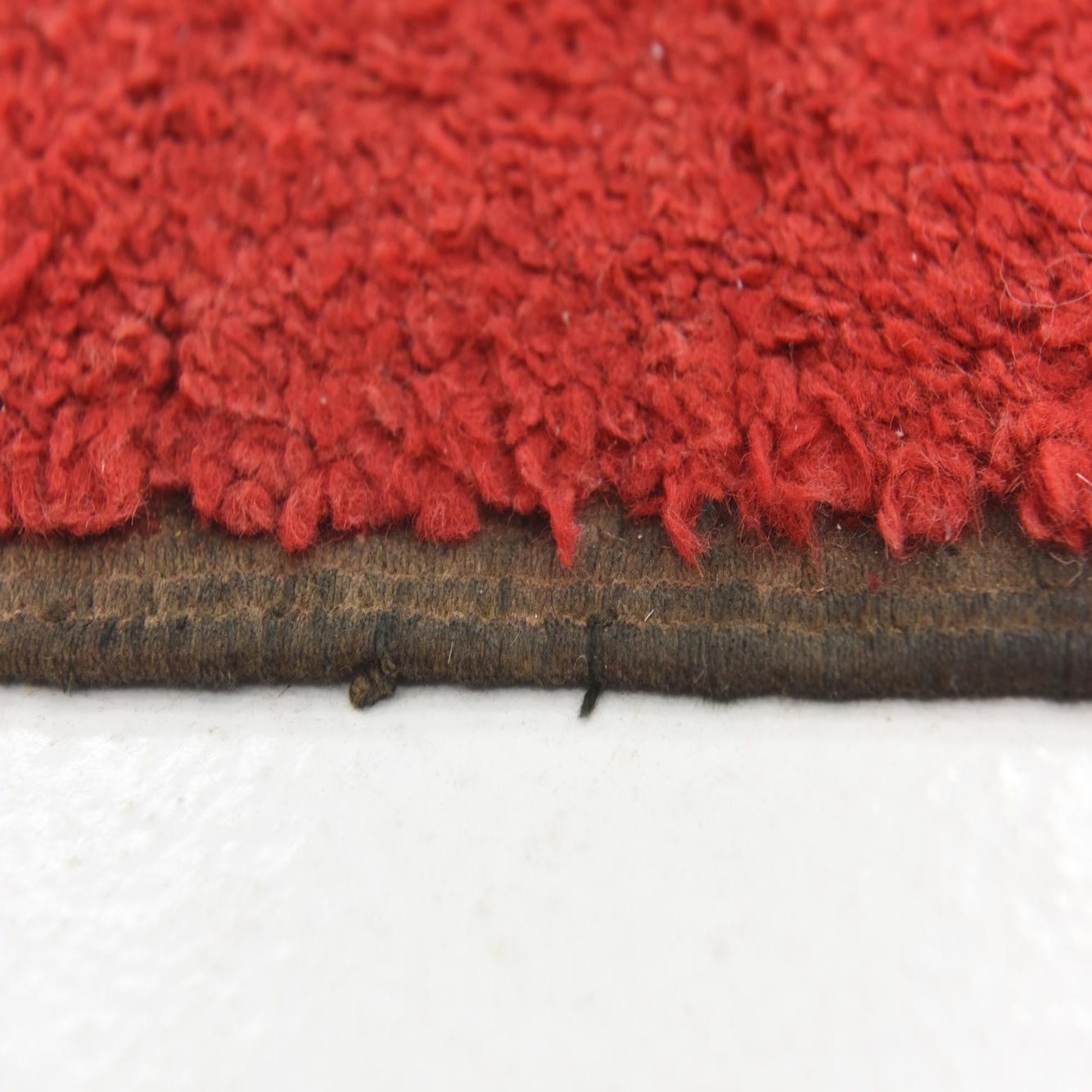 A vibrant 5x8 rectangular red shag rug with two small, colorful tribal zigzag patterns, perfect for a modern living room.