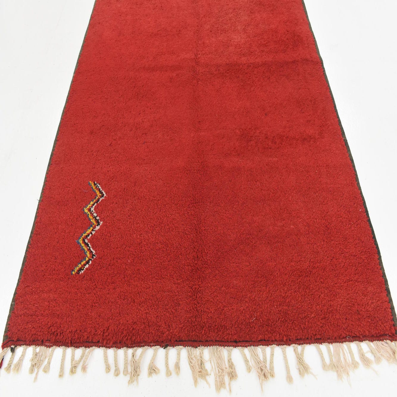 This Moroccan collection rug presents a vibrant red background with subtle yet striking geometric patterns accentuated in black, green, navy blue, and yellow, bringing a bold pop of color to any room. The design offers a minimalist aesthetic, with patterns that evoke the traditional artistry of Moroccan craftsmanship. Its authentic hand-knotted construction of 100% wool provides a plush texture, ensuring both comfort underfoot and durability.