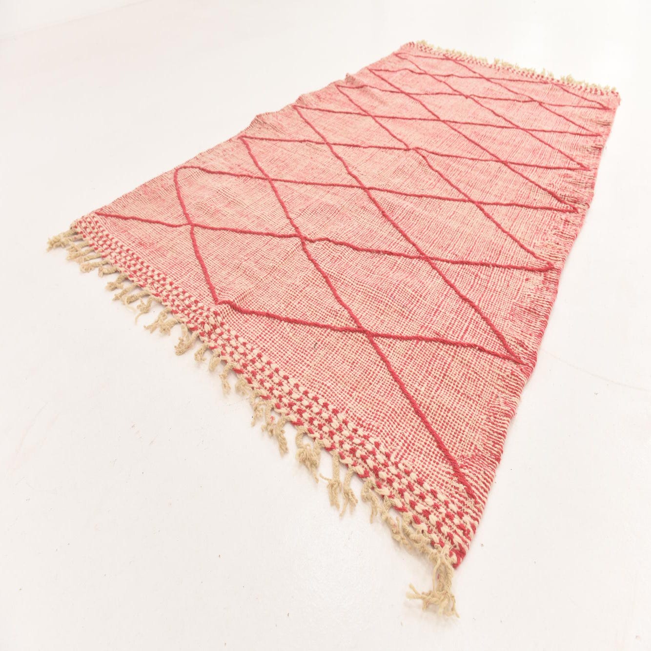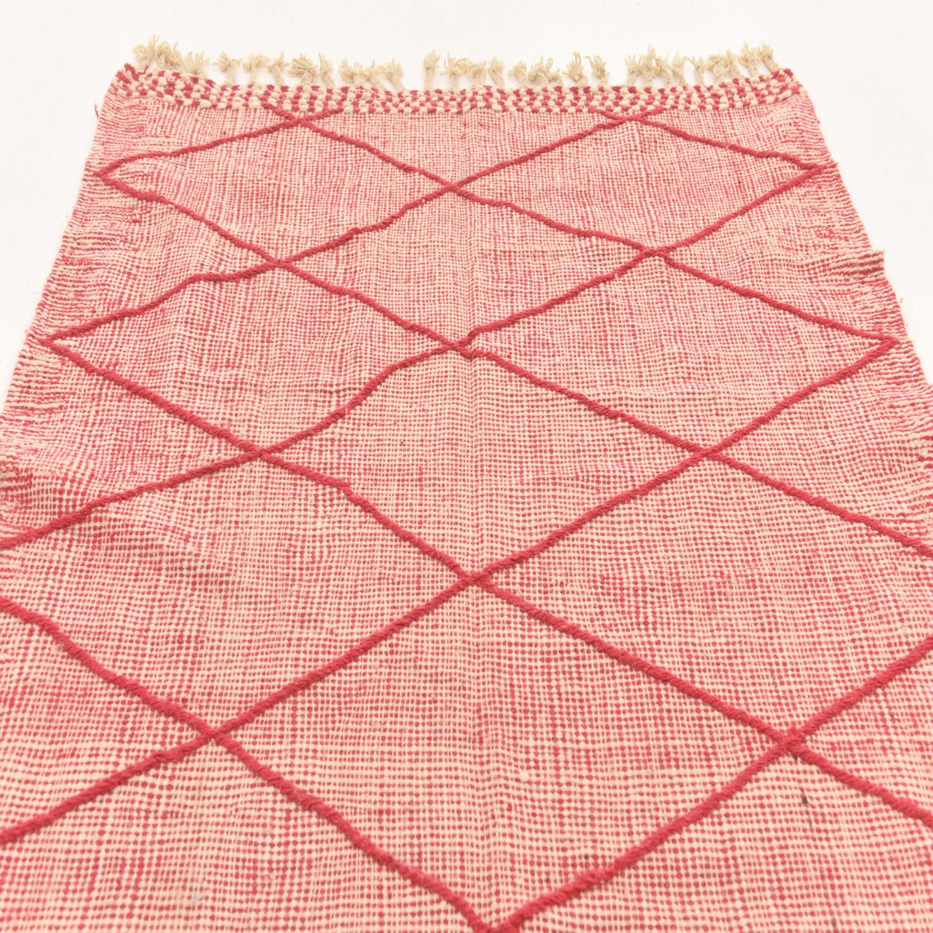 A 5x8 rectangular red Moroccan shag rug with a tribal diamond pattern and fringed ends, perfect for a living room.