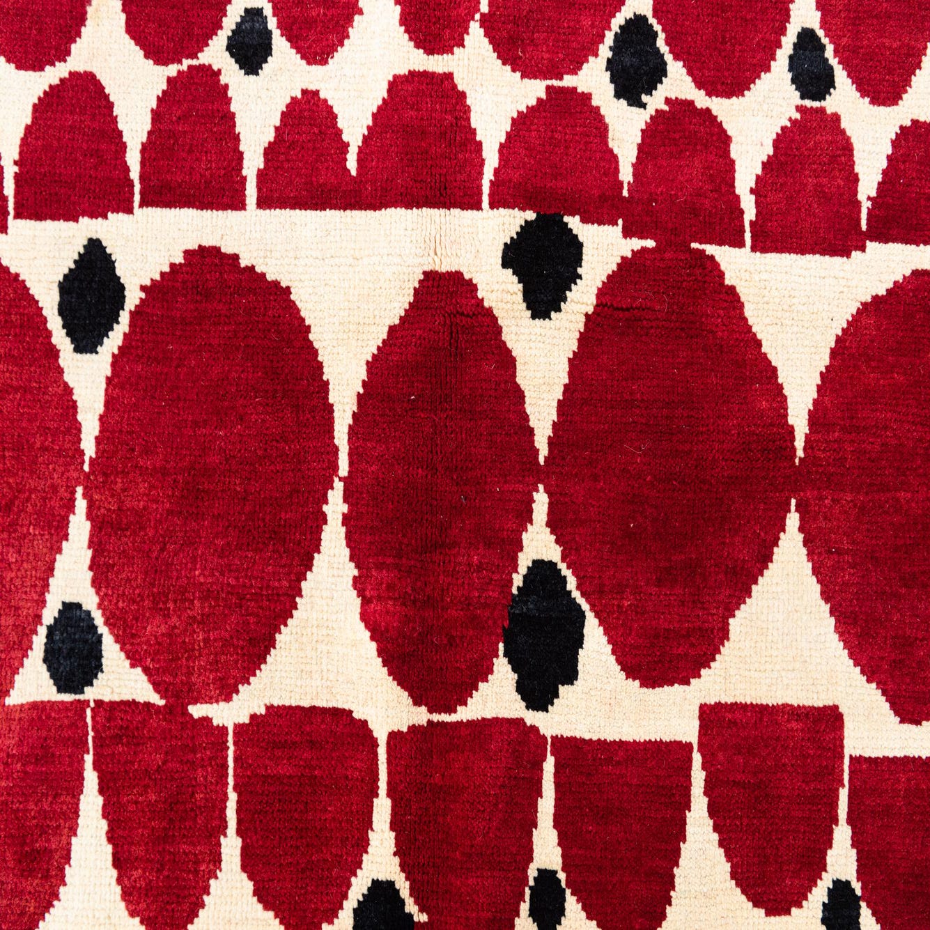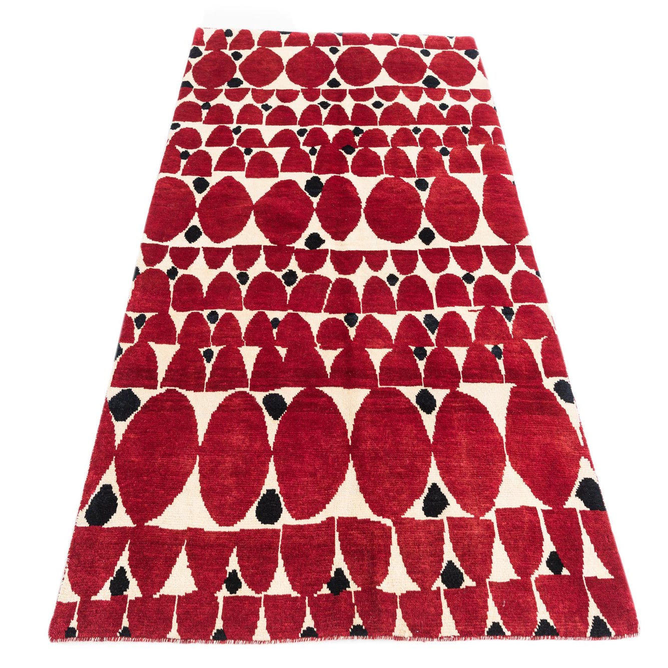A 5x8 rectangular red and cream wool shag rug with a modern tribal pattern of large and small red geometric shapes and small black dots.