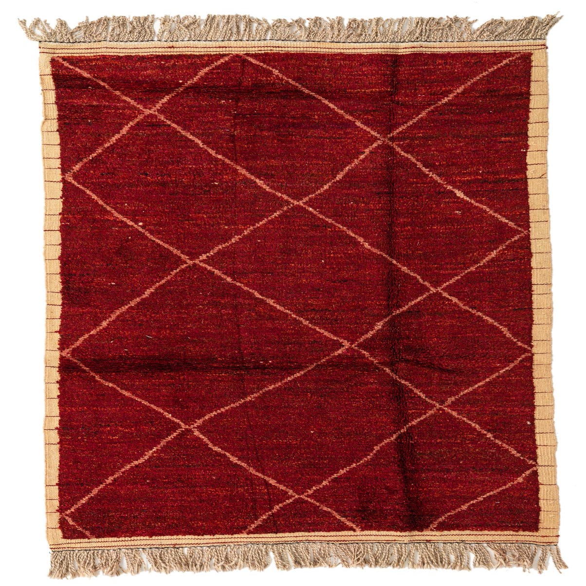 This Moroccan collection rug, measuring 5x8, is a testament to traditional craft with its hand-knotted construction of 100% wool. It showcases a rich, red background complemented by a geometric pattern with lines and diamond shapes in contrasting beige and black hues, offering both visual interest and timeless appeal. The natural texture of wool provides a soft, plush feel underfoot, while the fringe detailing adds a classic, artisanal touch.