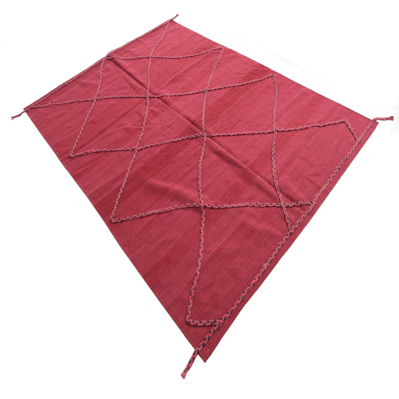 The rug’s simplistic yet impactful pattern is suited for a variety of interior settings, from modern to bohemian and eclectic spaces. Its size makes it a good fit for living rooms, under a smaller dining table, or as a bold statement in a bedroom. The rich red tone can either complement a room with warm color palettes or serve as a striking contrast in a more subdued, neutral space. The handcrafted quality of this wool rug adds both a tactile and visual depth to the decor, suitable for those aiming to introduce a touch of artisanal craftsmanship to their home.