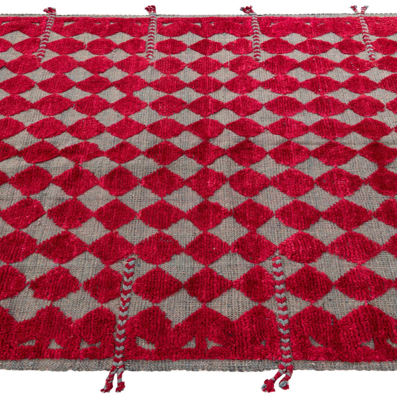 A 5x8 rectangular red and gray wool shag rug with a tribal diamond pattern and decorative tassels.