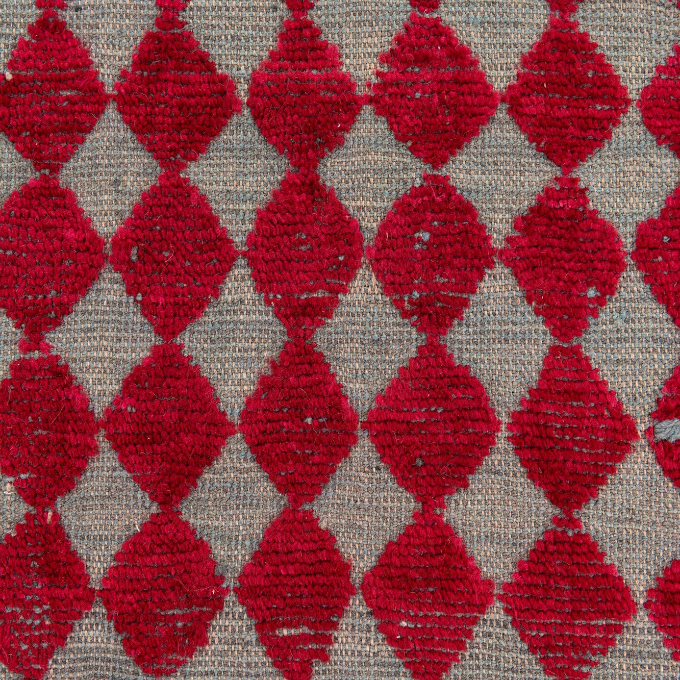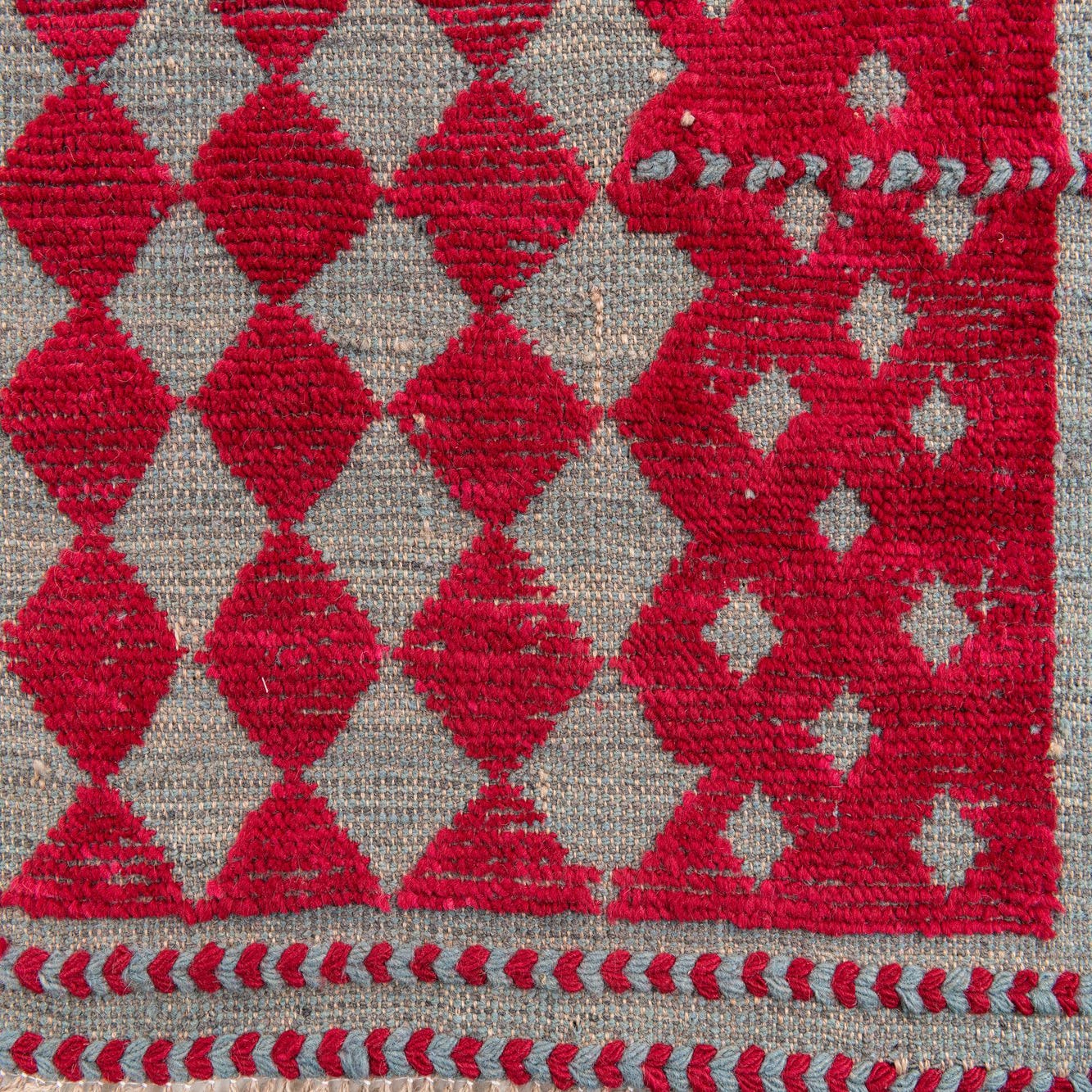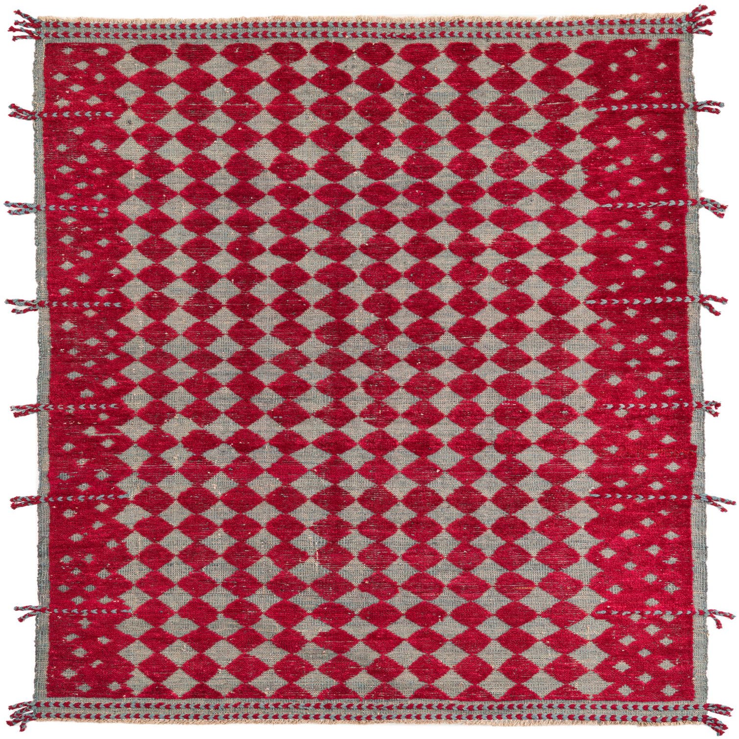 A 5x8 rectangular Moroccan shag rug with a bold red and gray tribal diamond pattern and decorative tassels.
