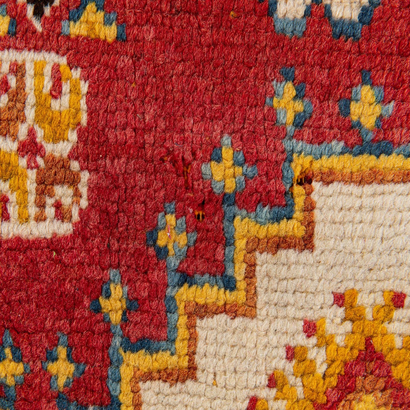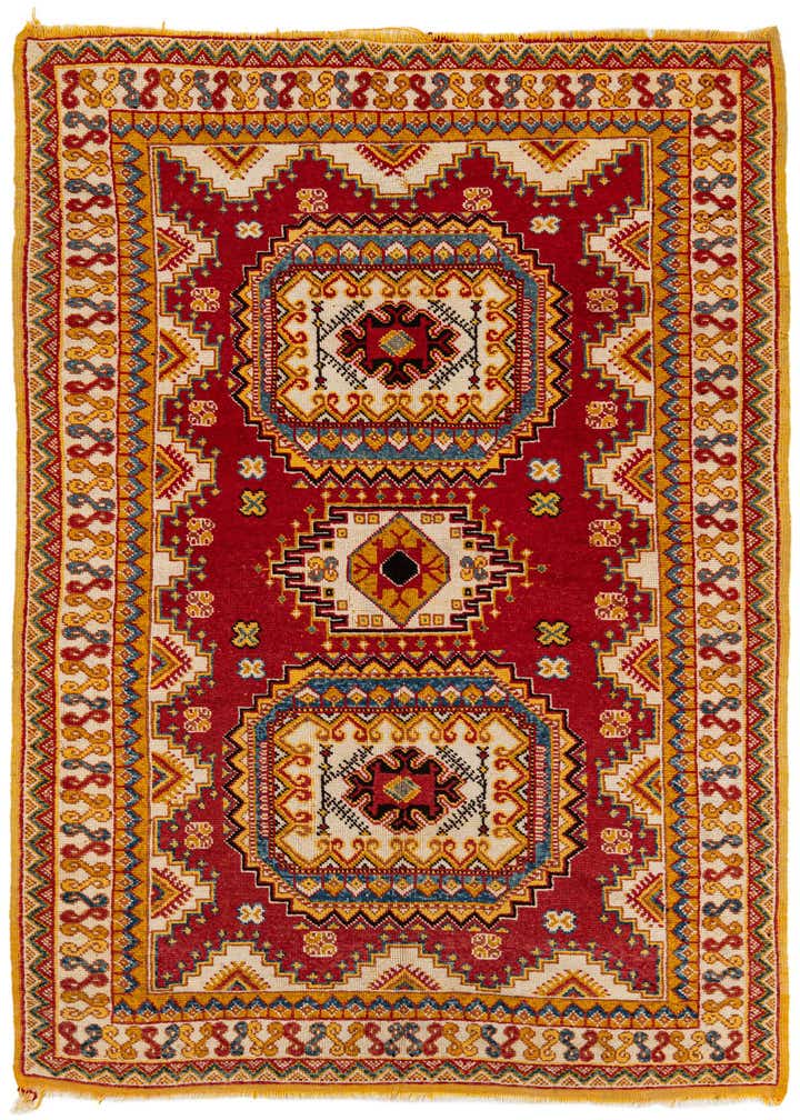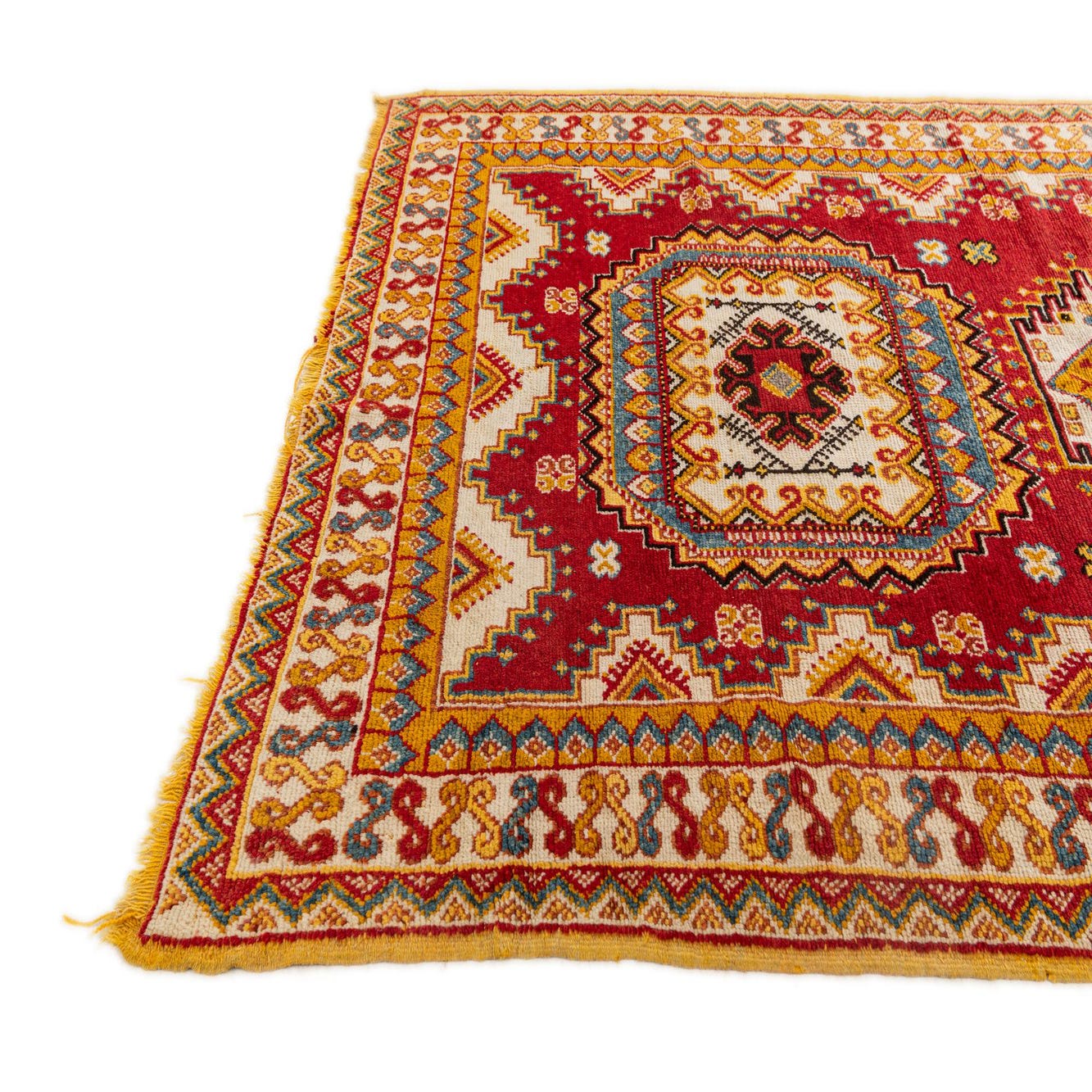 Primary color is Red. Colors in this rug include: Red, Ivory, Yellow, Black, Light Blue.